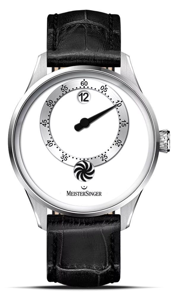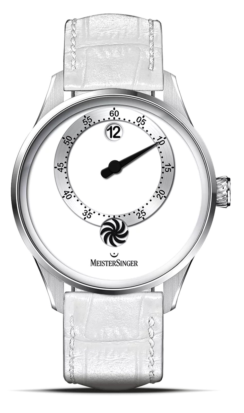 Hlavným znakom hodiniek je však jednoduchý, ale veľmi pôsobivý biely ciferník, ktorý stelesňuje štýl a eleganciu. Je zasadený do mimoriadne úzkeho rámčeka. Na ciferníku, ktorý zobrazuje čas minimalistickým, pokojným a úplne intuitívnym spôsobom, je mimo stredu umiestnená ručička, ktorá meria uplynuté minúty. Hodiny sa zobrazujú v dokonale okrúhlom okienku na 12. hodine, kde sa číslice menia s absolútnou presnosťou hodinu po hodine. Potom pod logom nájdeme jemne rotujúce slnečné koliesko MeisterSinger - jemný ukazovateľ chodu, ktorý nahrádza sekundovú ručičku a potvrdzuje, že strojček je v prevádzke bez toho, aby narušil čistotu a harmóniu ciferníka. Táto novo koncipovaná geometria dodáva ciferníku pozoruhodný pocit hĺbky, dynamického napätia a vlastného jedinečného zmyslu pre poriadok.