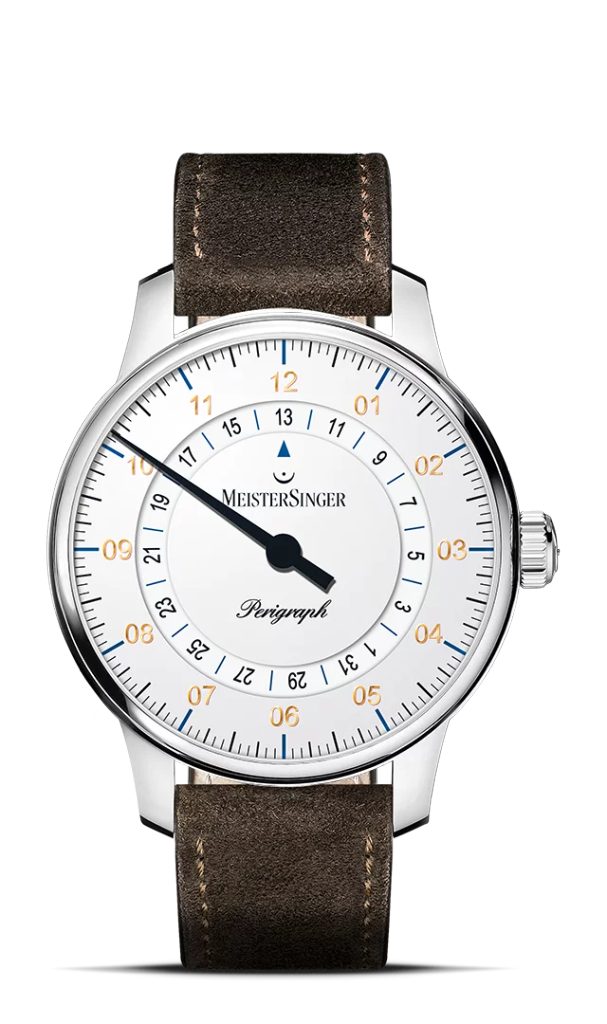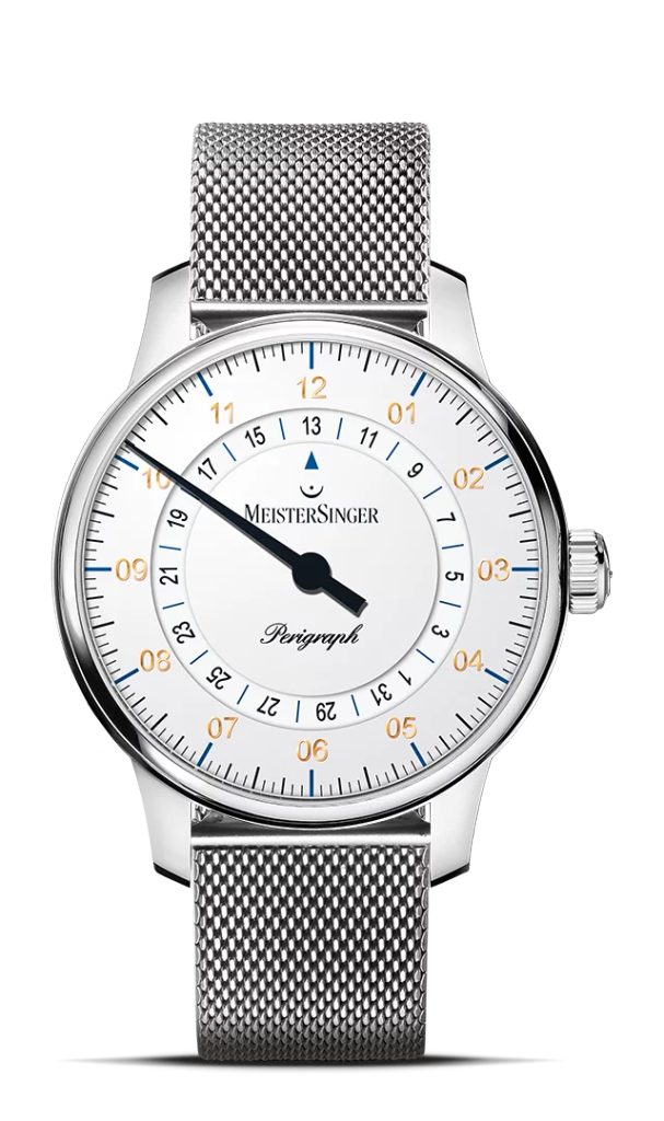 Hodiny MeisterSinger Perigraph 38 mm BM1101G patria do série Classic Plus a ponúkajú netradičné, ale o to zaujímavejšie zobrazenie času pomocou jednej ručičky. Hlavným prvkom tohto modelu je zobrazenie dátumu, ktorý sa zobrazuje prostredníctvom disku v strede ciferníka. Fanúšikovia kvalitného hodinárstva a netradičných riešení si preto určite prídu na svoje.