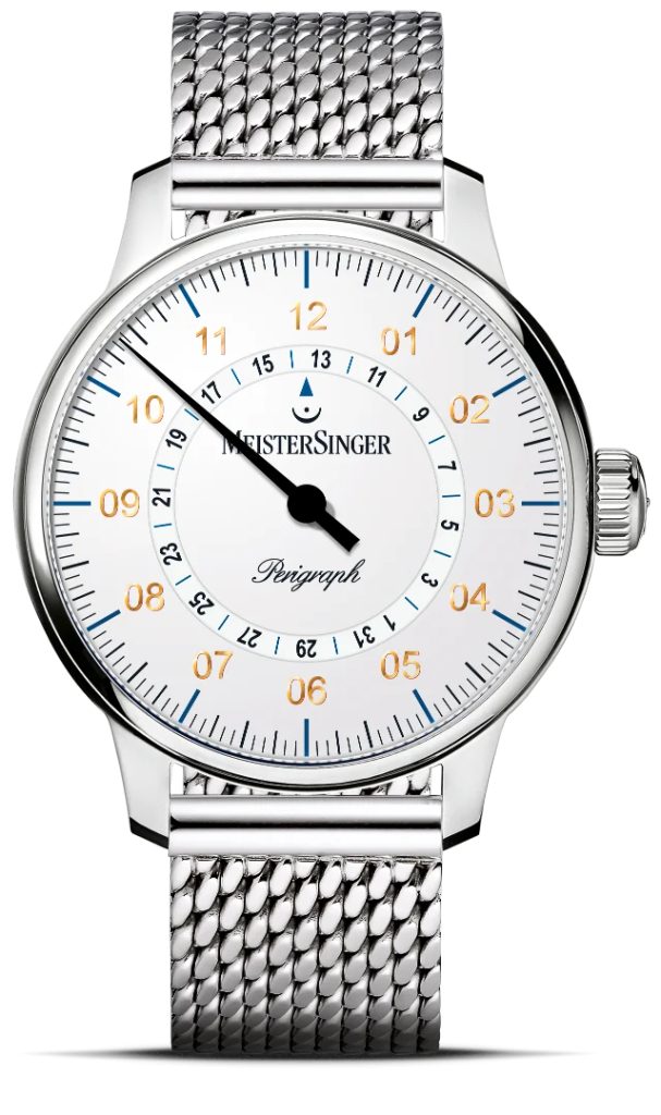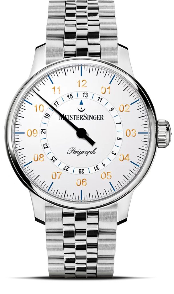 Hodiny MeisterSinger Perigraph AM1001G patria do série Classic Plus a ponúkajú netradičné, ale o to zaujímavejšie zobrazenie času pomocou jednej ručičky. Hlavným prvkom tohto modelu je ukazovateľ dátumu, ktorý sa zobrazuje pomocou disku v strede ciferníka. Fanúšikovia kvalitného hodinárstva a netradičných riešení si preto určite prídu na svoje.