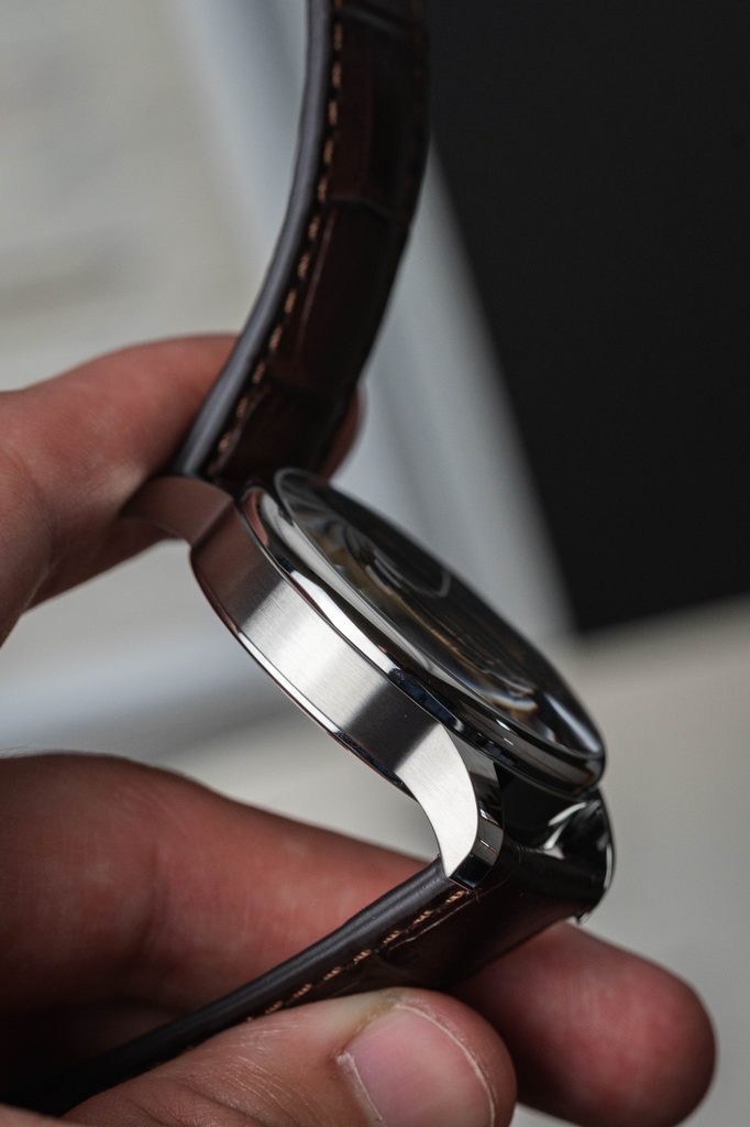 Na bordovom ciferníku s jemnou štruktúrou, vďaka ktorej sa na svetle trbliece bielymi kontrastmi a jemnými zlatožltými akcentmi, sa decentne zobrazuje logo a názov modelu v ozdobnom písme. Stredobodom ciferníka je potom centrálna, špeciálne navrhnutá mimoriadne dlhá ručička, pod ktorou sa v dolnej polovici ciferníka nachádza ukazovateľ rezervy chodu.