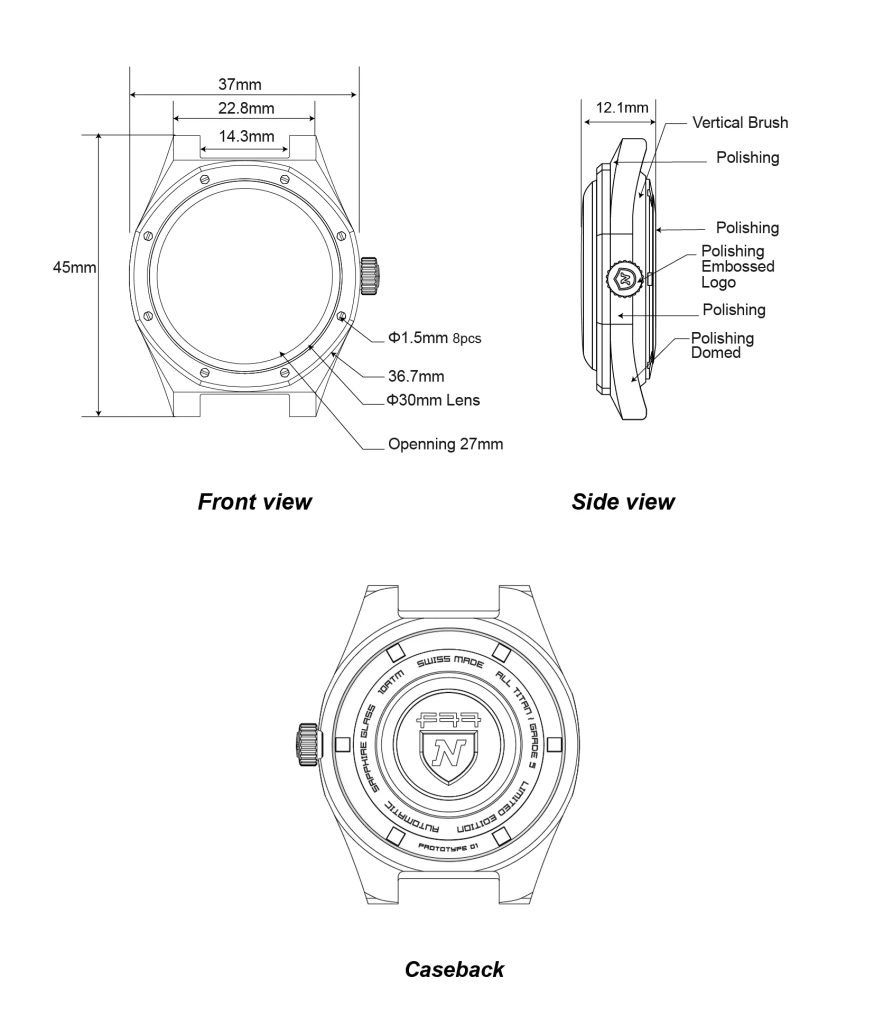 Puzdro z ušľachtilej ocele 316 s priemerom 37 mm a hrúbkou 12 mm je upravené lešteným a saténovo brúseným povrchom. Vo vnútri modelu pracuje automatický strojček SOPROD P024. Celé hodinky potom chráni kvalitné dvojité zafírové sklíčko, ktoré zaručuje maximálnu ochranu pred poškriabaním.