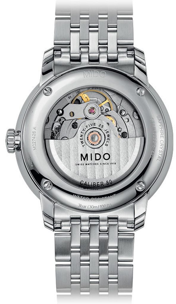 Hodinky Mido M027.426.11.018.00 majú puzdro vrátane náramku vyrobené z ušľachtilej ocele 316L. Vo vnútri spoľahlivo tiká švajčiarsky mechanický strojček Mido Caliber 80 Big Date (na báze ETA C07.651) s automatickým naťahovaním. Pracuje pri frekvencii 21 600 polfrekvencií za hodinu, má 25 drahokamov a predovšetkým predĺženú rezervu chodu na 80 hodín. Činnosť tohto stroja možno sledovať cez priehľadný volič. Na pozícii 6 hodín sa nachádza praktický veľký ukazovateľ dátumu - takzvaný Big Date.