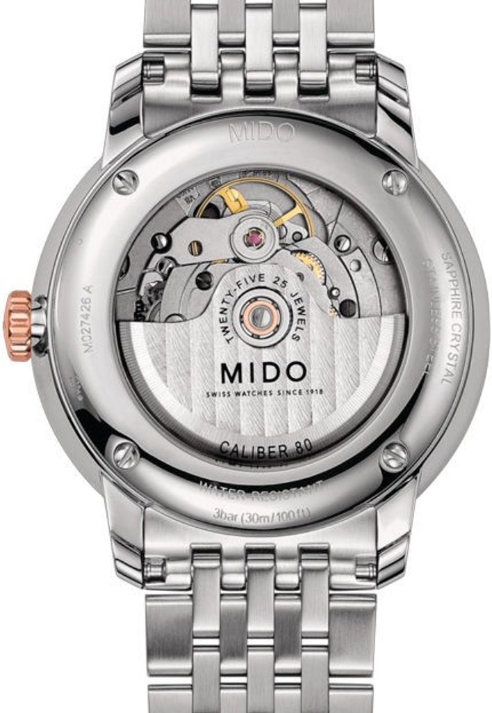 Hodinky Mido M027.426.22.018.00 majú puzdro vrátane náramku vyrobené z nehrdzavejúcej ocele 316L s čiastočnou PVD úpravou v ružovom zlate. Vo vnútri spoľahlivo tiká švajčiarsky mechanický strojček Mido Caliber 80 Big Date (založený na ETA C07.651) s automatickým naťahovaním. Pracuje pri frekvencii 21 600 polfrekvencií za hodinu, má 25 drahokamov a predovšetkým predĺženú rezervu chodu na 80 hodín. Činnosť tohto stroja možno sledovať cez priehľadný volič. Na pozícii 6 hodín sa nachádza praktický veľký ukazovateľ dátumu - takzvaný Big Date.