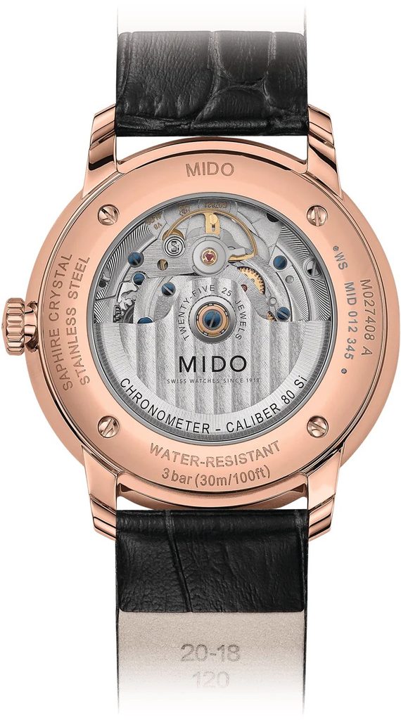 Hodinky Mido M027.408.36.031.00 majú puzdro z nehrdzavejúcej ocele 316L s povrchovou úpravou ružovým zlatom PVD, ktoré je doplnené koženým remienkom. Spoľahlivo v ňom tiká švajčiarsky mechanický strojček Mido Caliber 80 COSC Silicon (na báze ETA C07.821) s automatickým naťahovaním. Pracuje pri frekvencii 21 600 polfrekvencií za hodinu, má 25 drahokamov a predovšetkým predĺženú rezervu chodu na 80 hodín. Stroj je certifikovaný COSC. Vďaka tomu môže niesť označenie "Chronometer" a spĺňa najprísnejšie požiadavky na presnosť chodu. Okrem toho má zotrvačník silikónový vlásenkový valec, ktorý okrem iných jedinečných vlastností (napr. lepšej presnosti) veľmi dobre odoláva magnetickým poliam. Činnosť tohto stroja možno pozorovať cez priehľadnú matricu. Na pozícii 3 hodín sa nachádza praktický ukazovateľ dátumu.