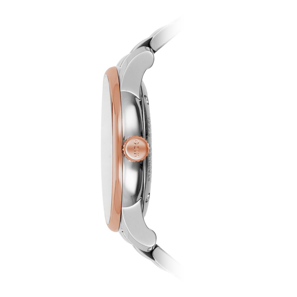 Hodinky Mido M8600.9.N6.1 majú puzdro a náramok z nehrdzavejúcej ocele 316L s čiastočnou PVD úpravou v ružovom zlate. Švajčiarsky mechanický strojček Mido Caliber 80 (na báze ETA C07.611) s automatickým naťahovaním spoľahlivo tiká v puzdre. Pracuje pri frekvencii 21 600 polfrekvencií za hodinu, má 25 drahokamov a predovšetkým predĺženú rezervu chodu na 80 hodín. Činnosť tohto stroja možno pozorovať cez priehľadnú matricu. Na pozícii 4 - 5 hodín sa nachádza praktický ukazovateľ dátumu.