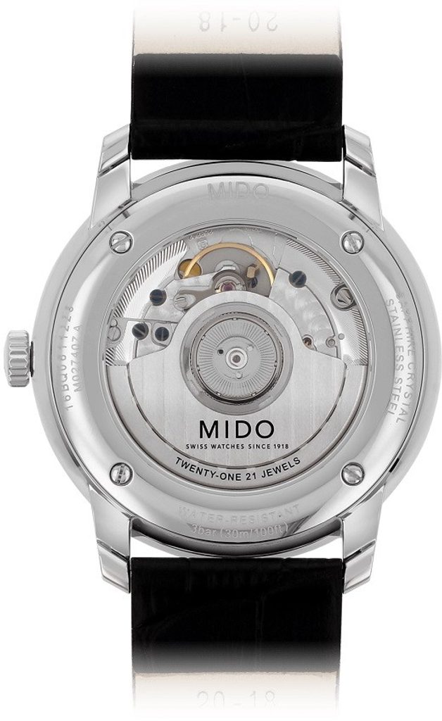 Hodinky Mido M027.407.16.010.00 majú puzdro z nehrdzavejúcej ocele 316L, ktoré vhodne dopĺňa kožený remienok. V puzdre spoľahlivo tiká švajčiarsky mechanický strojček Mido Caliber 1192 (na báze ETA 2892-A2) s automatickým naťahovaním. Pracuje s frekvenciou 28800 polfrekvencií za hodinu, má 21 drahokamov a rezervu chodu 42 hodín. Činnosť tohto stroja možno sledovať cez priehľadný volič. Na pozícii 3 hodín sa nachádza praktický ukazovateľ dátumu.