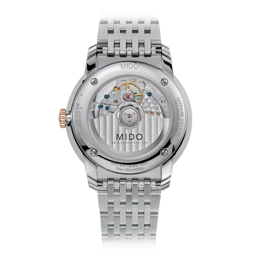 Hodinky Mido M027.407.22.011.00 majú puzdro vrátane náramku vyrobené z ušľachtilej ocele 316L s čiastočnou PVD úpravou v ružovom zlate. V puzdre spoľahlivo tiká švajčiarsky mechanický strojček Mido Caliber 72 (na báze ETA A31.111) s automatickým náťahom. Pracuje s frekvenciou 28 800 polfrekvencií za hodinu, má 21 drahokamov a zvýšenú rezervu chodu 72 hodín. Na pozícii 3 hodín nájdeme praktický ukazovateľ dátumu.