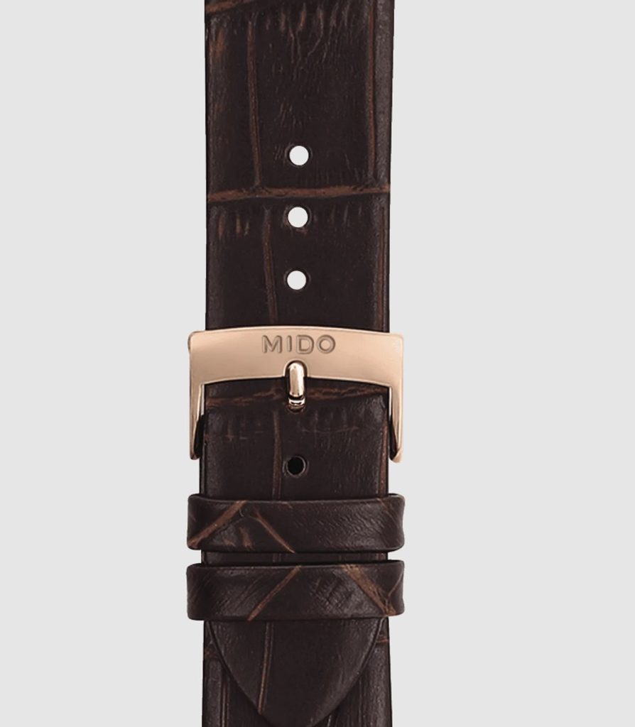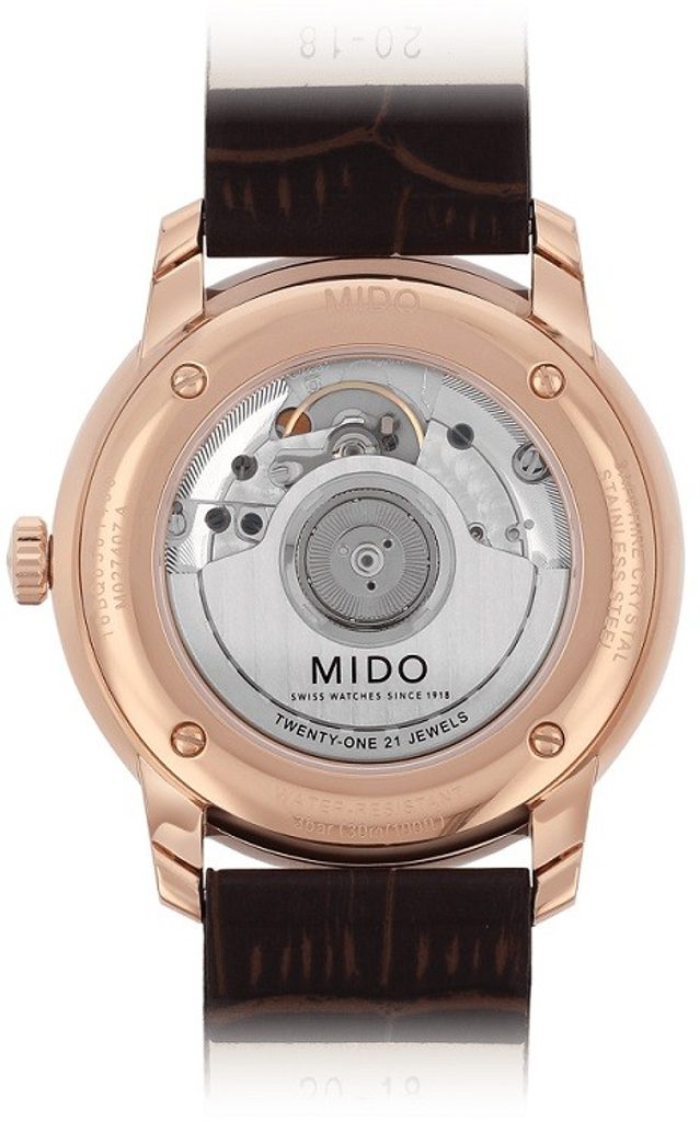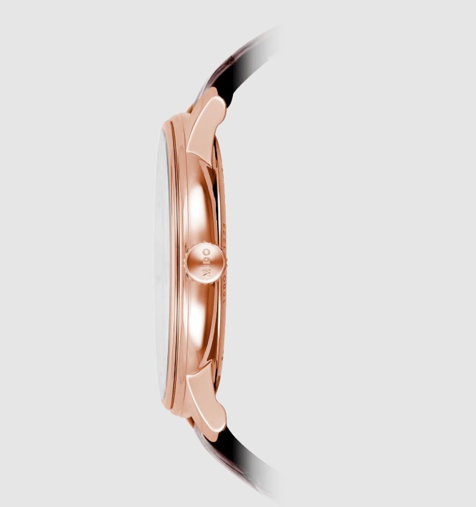 Hodinky Mido M027.407.36.080.00 majú puzdro z nehrdzavejúcej ocele 316L s povrchovou úpravou ružovým zlatom PVD, ktoré vhodne dopĺňa kožený remienok. V puzdre spoľahlivo tiká švajčiarsky mechanický strojček Mido Caliber 1192 (na báze ETA 2892-A2) s automatickým naťahovaním. Pracuje s frekvenciou 28800 polfrekvencií za hodinu, má 21 drahokamov a rezervu chodu 42 hodín. Činnosť tohto stroja možno sledovať cez priehľadný volič. Na pozícii 3 hodín sa nachádza praktický ukazovateľ dátumu.