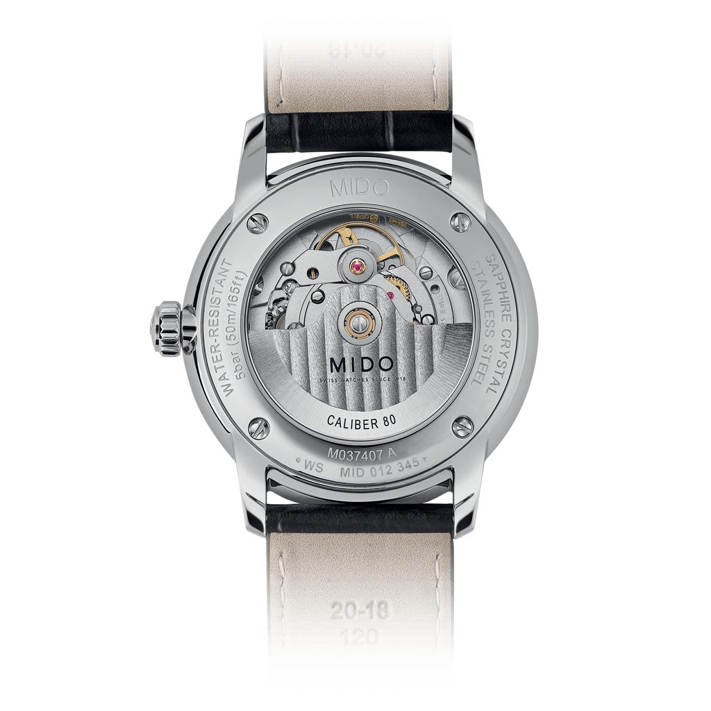 Hodinky Mido M037.407.16.031.01 majú puzdro z nehrdzavejúcej ocele 316L, ktoré vhodne dopĺňa kožený remienok. V puzdre spoľahlivo tiká švajčiarsky mechanický strojček Mido Caliber 80 (na báze ETA C07.611) s automatickým naťahovaním. Pracuje pri frekvencii 21 600 polfrekvencií za hodinu, má 25 drahokamov a predovšetkým predĺženú rezervu chodu na 80 hodín. Činnosť tohto stroja možno pozorovať cez priehľadnú matricu. Na pozícii 3 hodín sa nachádza praktický ukazovateľ dátumu.