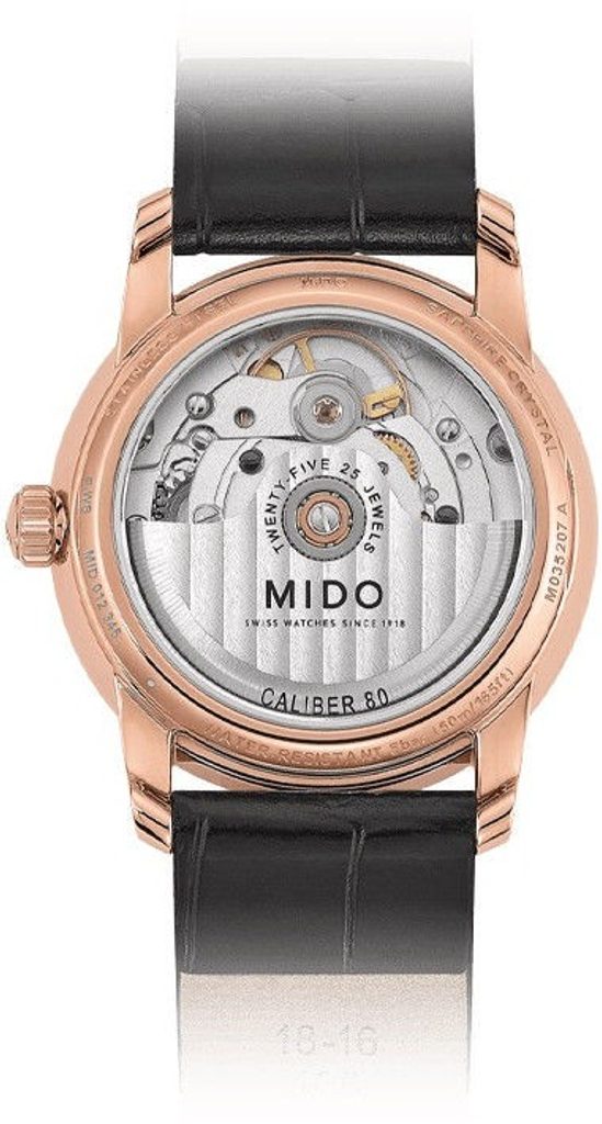 Hodinky Mido M035.207.36.471.00 majú puzdro z nehrdzavejúcej ocele 316L s PVD úpravou v zlatej farbe, ktoré vkusne dopĺňa kožený remienok. Puzdro spoľahlivo tiká švajčiarskym mechanickým strojčekom Mido Caliber 80 (na báze ETA C07.611) s automatickým naťahovaním. Pracuje pri frekvencii 21 600 polfrekvencií za hodinu, má 25 drahokamov a predovšetkým predĺženú rezervu chodu na 80 hodín. Činnosť tohto stroja možno pozorovať cez priehľadnú matricu. Na pozícii 6 hodín sa nachádza praktický ukazovateľ dátumu.
