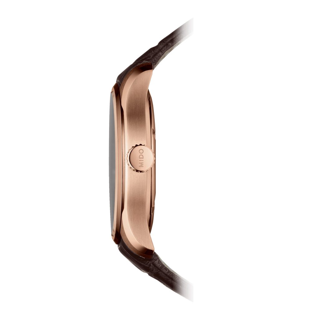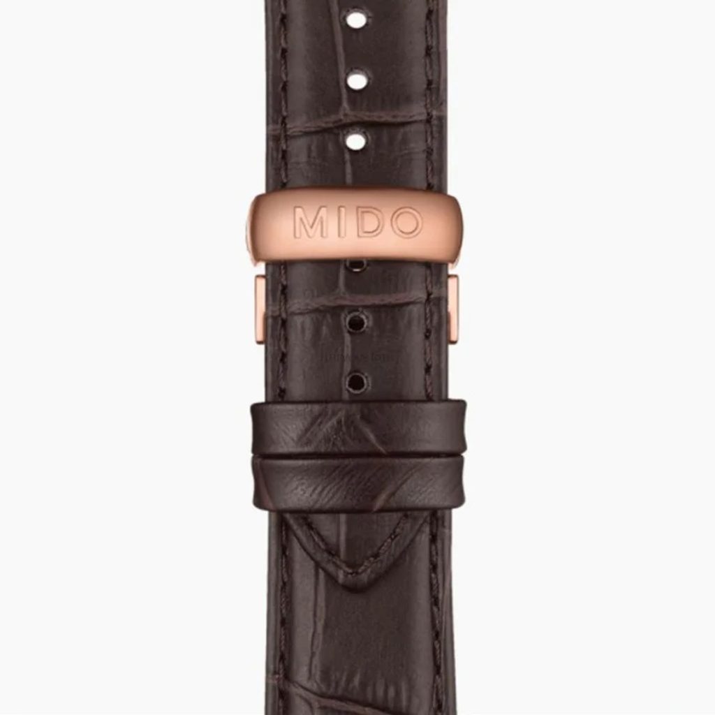 Hodinky Mido M024.630.36.041.00 majú puzdro vyrobené z ušľachtilej ocele 316L s PVD úpravou vo farbe ružového zlata, ktoré vkusne dopĺňa kožený remienok. V puzdre spoľahlivo tiká švajčiarsky mechanický strojček Mido Caliber 80 (základom je ETA C07.621) s automatickým náťahom. Ten pracuje na frekvencii 21600 polokmitov za hodinu, disponuje 25 kameňmi a predovšetkým predĺženou rezervou chodu 80 hodín. Činnosť tohto strojčeka možno pozorovať priehľadným zadným viečkom. Na pozícii 3. hodiny nájdeme praktický ukazovateľ dátumu a dňa v týždni.