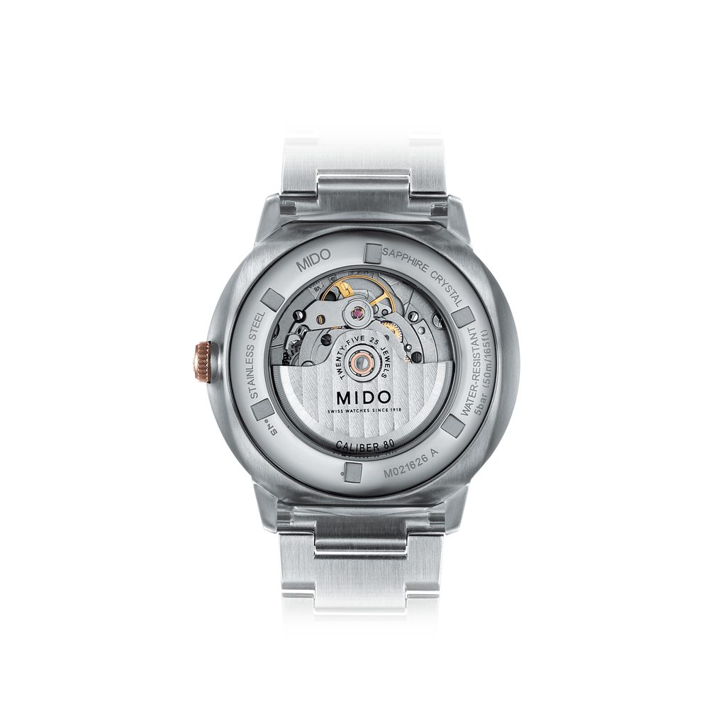 Hodinky Mido M021.626.22.061.00 majú puzdro vrátane náramku vyrobené z nehrdzavejúcej ocele 316L s čiastočnou PVD úpravou v ružovom zlate. Vo vnútri spoľahlivo tiká švajčiarsky mechanický strojček Caliber 80 Big Date (na báze ETA C07.651) s automatickým naťahovaním. Pracuje pri frekvencii 21 600 polfrekvencií za hodinu, má 25 drahokamov a predovšetkým predĺženú rezervu chodu na 80 hodín. Činnosť tohto stroja možno sledovať cez priehľadný volič. Na pozícii 6 hodín sa nachádza praktický veľký ukazovateľ dátumu - takzvaný Big Date.