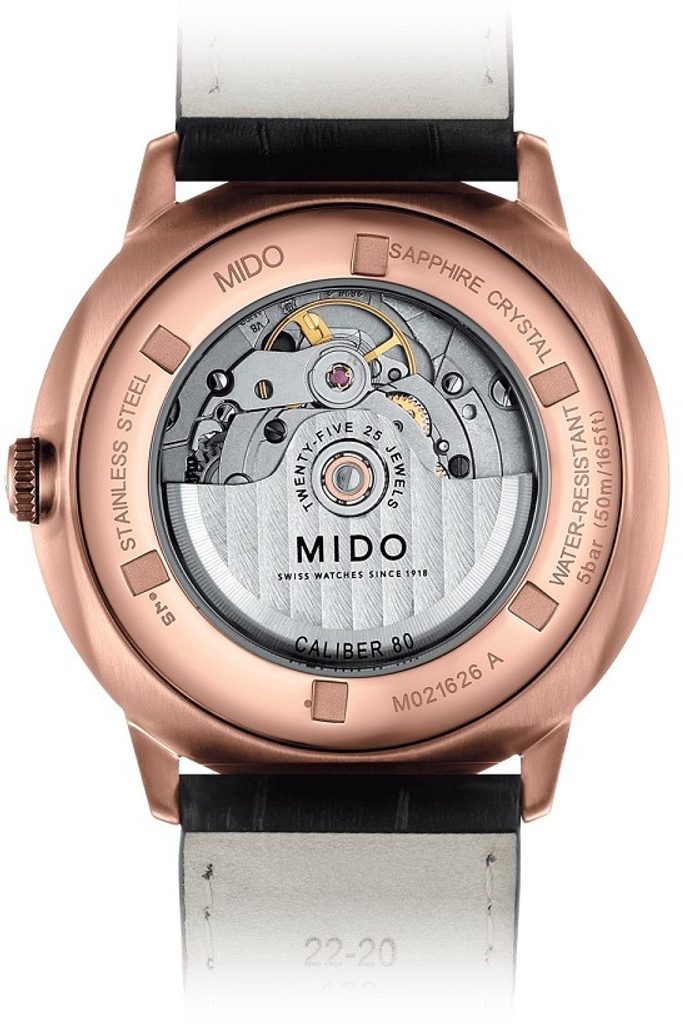Hodinky Mido M021.626.36.051.00 majú puzdro z nehrdzavejúcej ocele 316L s PVD úpravou v ružovom zlate, ktoré je doplnené koženým remienkom. Vo vnútri spoľahlivo tiká švajčiarsky mechanický strojček Caliber 80 Big Date (na báze ETA C07.651) s automatickým naťahovaním. Pracuje pri frekvencii 21 600 polfrekvencií za hodinu, má 25 drahokamov a predovšetkým predĺženú rezervu chodu na 80 hodín. Činnosť tohto stroja možno sledovať cez priehľadný volič. Na pozícii 6 hodín sa nachádza praktický veľký ukazovateľ dátumu - takzvaný Big Date.
