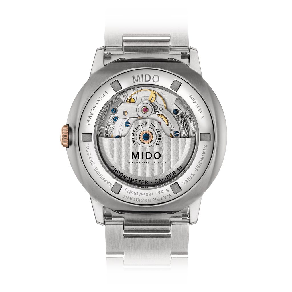 Hodinky Mido M021.431.22.031.00 majú puzdro vrátane náramku vyrobené z nehrdzavejúcej ocele 316L s čiastočnou PVD úpravou v ružovom zlate. Vo vnútri spoľahlivo tiká švajčiarsky mechanický strojček Mido Caliber 80 COSC Silicon (na báze ETA C07.821) s automatickým naťahovaním. Pracuje pri frekvencii 21 600 polfrekvencií za hodinu, má 25 drahokamov a predovšetkým predĺženú rezervu chodu na 80 hodín. Stroj je certifikovaný COSC. Vďaka tomu môže niesť označenie "Chronometer" a spĺňa najprísnejšie požiadavky na presnosť chodu. Okrem toho má zotrvačník silikónový vlásenku, ktorá okrem iných jedinečných vlastností (napr. lepšia presnosť) veľmi dobre odoláva magnetickým poliam. Činnosť tohto stroja možno pozorovať cez priehľadný stylus. Na pozícii 3 hodín sa nachádza praktický ukazovateľ dátumu a dňa v týždni.