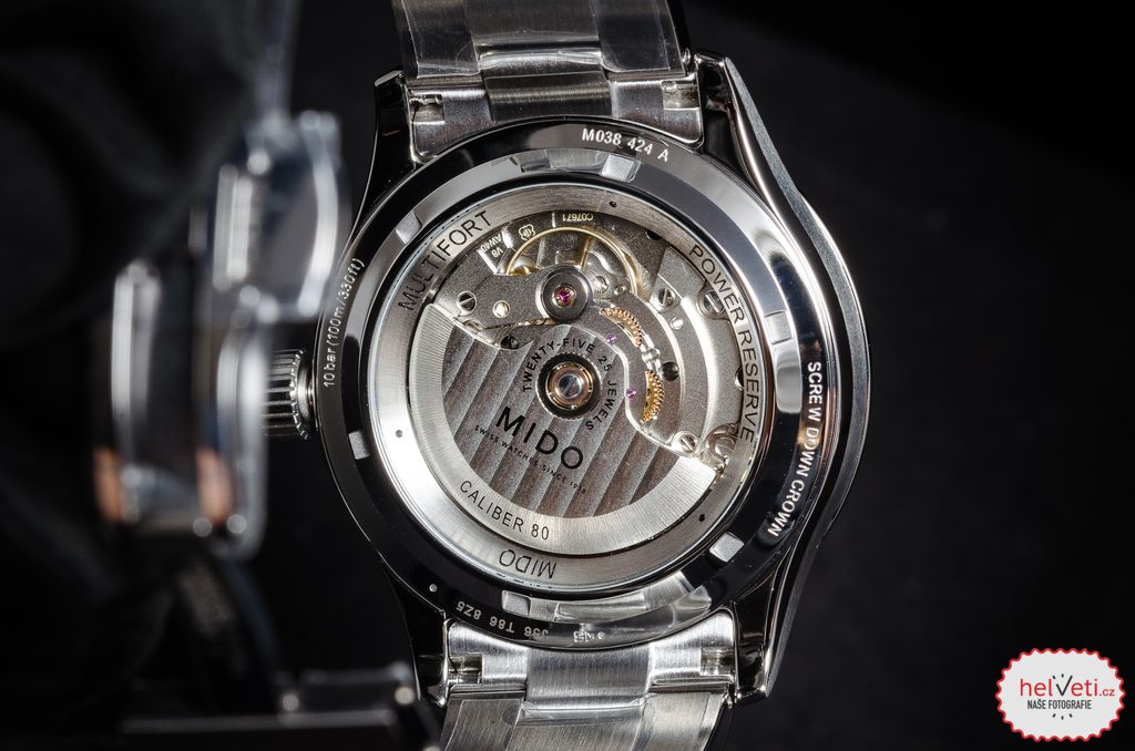 Hodinky Mido M038.424.11.041.00 majú puzdro vrátane náramku vyrobené z ušľachtilej ocele 316L. V puzdre spoľahlivo tiká švajčiarsky mechanický strojček Mido Caliber 80 (základom je ETA C07.671) s automatickým náťahom. Ten pracuje na frekvencii 21 600 polokmitov za hodinu, disponuje 25 kameňmi a predovšetkým predĺženou rezervou chodu 80 hodín. Veľmi praktická je potom funkcia ukazovateľa rezervy náťahu na pozícii 9. Na pozícii 3. hodiny nájdeme ukazovateľ dátumu. Činnosť tohto strojčeka možno pozorovať priehľadným zadným viečkom.
