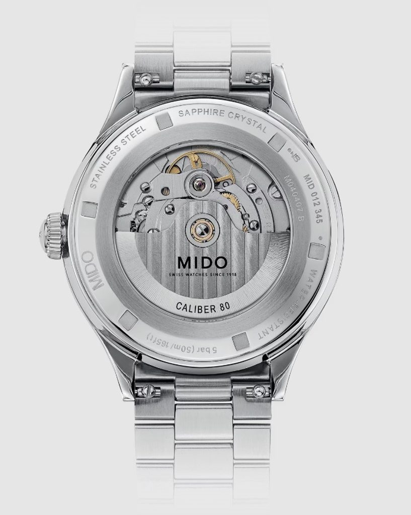 Hodinky Mido M040.407.11.047.00 majú puzdro vyrobené z ušľachtilej ocele 316L, ktoré dopĺňa oceľový náramok. V puzdre spoľahlivo tiká švajčiarsky mechanický strojček Caliber 80 (na báze ETA C07.621) s automatickým náťahom. Pracuje s frekvenciou 21 600 polfrekvencií za hodinu, má 25 drahokamov a predovšetkým predĺženú rezervu chodu na 80 hodín. Činnosť tohto strojčeka možno pozorovať cez priehľadnú matricu. Na pozícii 6 hodín nájdeme praktický ukazovateľ dátumu.