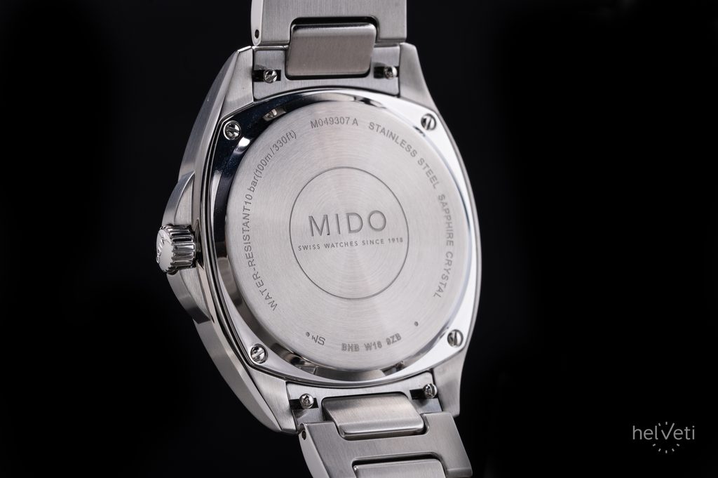 Hodinky Mido M049.307.11.136.00 majú puzdro vrátane náramku vyrobené z nehrdzavejúcej ocele 316L. Náramok je vybavený rýchloupínacími sponami, a preto sa dá ľahko vymeniť bez použitia náradia. V puzdre spoľahlivo tiká švajčiarsky mechanický strojček Caliber 72 (na báze ETA A31.111) s automatickým náťahom. Pracuje s frekvenciou 25200 polfrekvencií za hodinu, má 21 drahokamov a predovšetkým predĺženú rezervu chodu na 72 hodín. Na pozícii 12 hodín nájdeme praktický ukazovateľ dátumu.