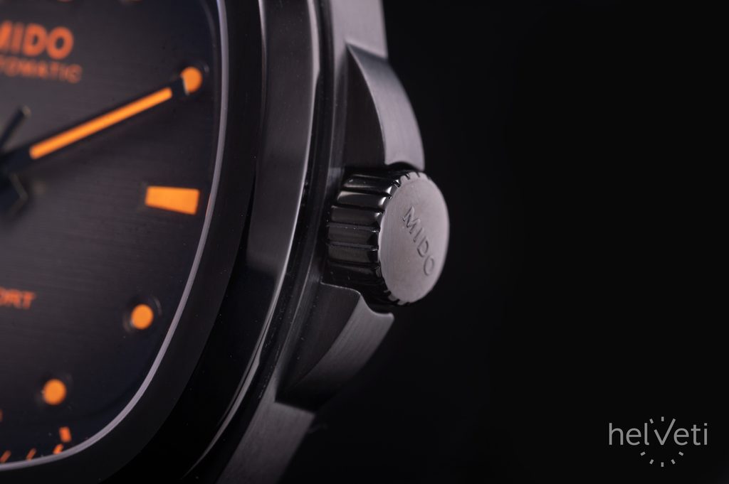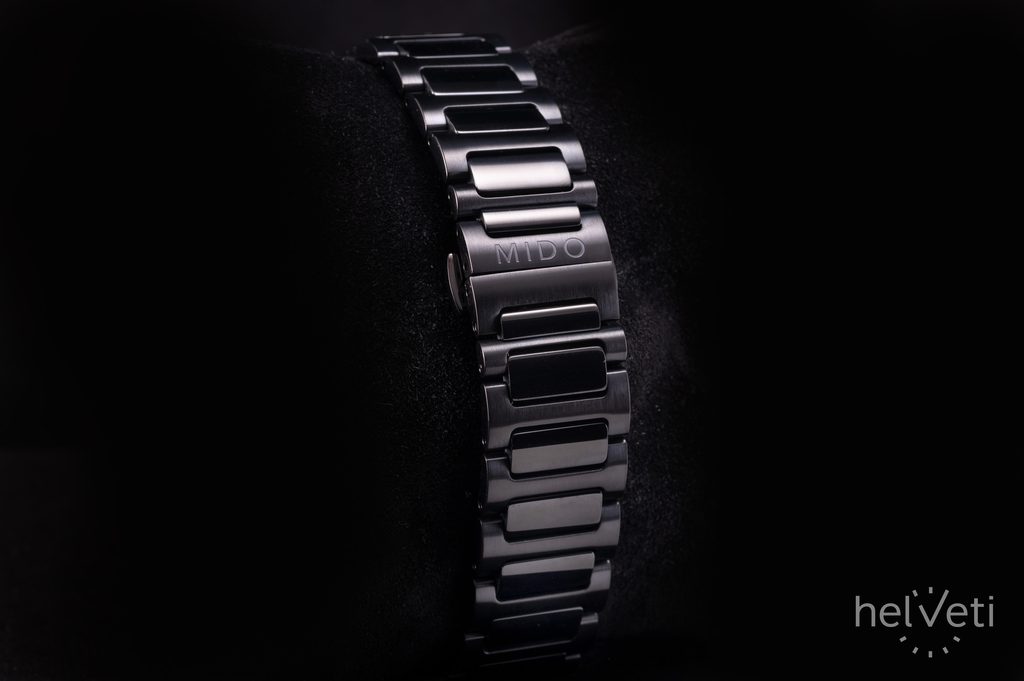 Model Mido M049.526.33.081.00 má puzdro vrátane náramku vyrobené z nehrdzavejúcej ocele 316L s čiernou PVD úpravou. Náramok je vybavený rýchloupínacími sponami, a preto sa dá ľahko vymeniť bez použitia náradia. V puzdre spoľahlivo tiká švajčiarsky mechanický strojček Caliber 80 Big Date (na báze ETA C07.651) s automatickým náťahom. Pracuje s frekvenciou 21 600 polfrekvencií za hodinu, má 25 drahokamov a predovšetkým predĺženú rezervu chodu na 80 hodín. Činnosť tohto strojčeka možno pozorovať cez priehľadný ciferník. Na pozícii 12 hodín nájdeme praktický veľký ukazovateľ dátumu - takzvaný Big Date.