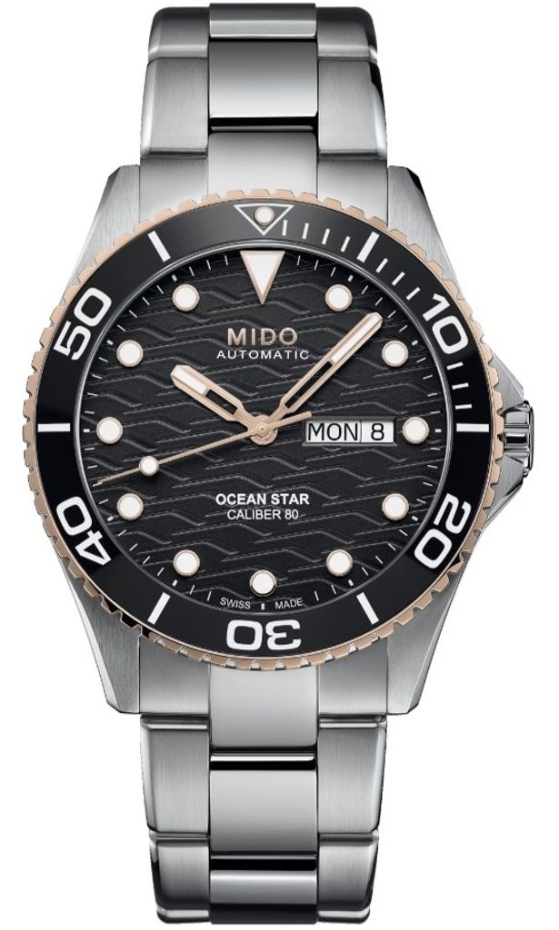 Hodinky Mido M042.430.11.081.00 majú puzdro vrátane náramku vyrobené z ušľachtilej ocele 316L s ružovozlatou PVD úpravou lunety. Vo vnútri spoľahlivo tiká švajčiarsky mechanický strojček Caliber 80 (na báze ETA C07.621) s automatickým naťahovaním. Pracuje s frekvenciou 21 600 polfrekvencií za hodinu, má 25 drahokamov a predovšetkým predĺženú rezervu chodu na 80 hodín. Na pozícii 3 hodín nájdeme praktický ukazovateľ dátumu a dňa v týždni. Na meranie časových úsekov možno použiť jednosmerne otočnú keramickú potápačskú lunetu.