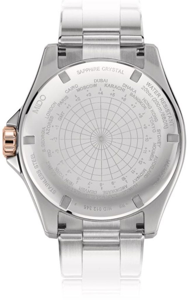 Hodinky Mido M026.629.22.051.00 majú puzdro vrátane náramku vyrobené z nehrdzavejúcej ocele 316L s čiastočnou PVD úpravou v ružovom zlate. Vo vnútri spoľahlivo tiká švajčiarsky mechanický strojček Mido Caliber 80 (založený na ETA C07.661) s automatickým naťahovaním. Pracuje pri frekvencii 21 600 polfrekvencií za hodinu, má 25 drahokamov a predovšetkým predĺženú rezervu chodu na 80 hodín. Cestujúcim poslúži funkcia GMT - teda ukazovateľ druhého časového pásma v podobe štvrtej ručičky. Okrem toho ide o takzvaný True GMT, kde sa ručička GMT pohybuje spolu s nastavením času a nastavenie hlavnej hodinovej ručičky potom prebieha v skokoch po jednej hodine, zatiaľ čo domovský čas na ručičke GMT zostáva nezmenený. Na pozícii 3 hodín sa nachádza praktický ukazovateľ dátumu. Na meranie časových úsekov možno použiť jednosmerne otočnú keramickú potápačskú lunetu.