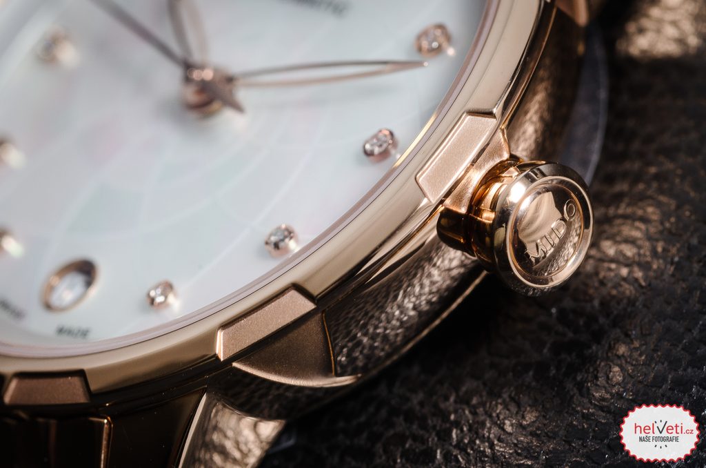 Elegantný a zároveň prehľadný číselník, ktorý zdobí 11 diamantov, je chránený zafírovým sklíčkom, ktoré zaručuje maximálnu odolnosť voči poškriabaniu. Obojstranná antireflexná vrstva potom prináša dokonalú čitateľnosť aj za ostrého slnka. Vodeodolnosť tohto modelu je 30m (3 Bar), zvládne teda minimálny kontakt s vodou, ako je dážď či umývanie rúk.