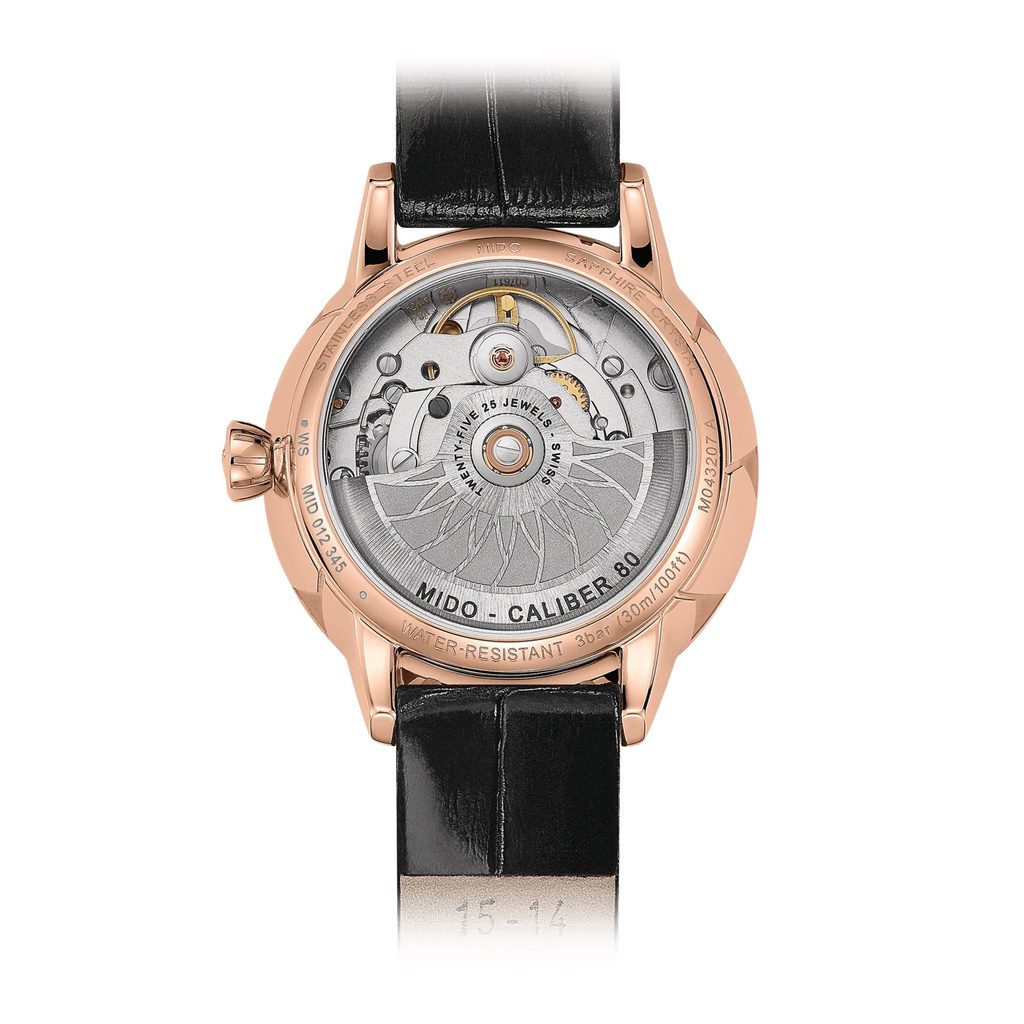 Hodinky Mido M043.207.36.018.00 majú puzdro z nehrdzavejúcej ocele 316L s povrchovou úpravou ružovým zlatom PVD, ktoré vhodne dopĺňa kožený remienok. V puzdre spoľahlivo tiká švajčiarsky mechanický strojček Mido Caliber 80 (na báze ETA C07.611) s automatickým naťahovaním. Pracuje pri frekvencii 21 600 polfrekvencií za hodinu, má 25 drahokamov a predovšetkým predĺženú rezervu chodu na 80 hodín. Činnosť tohto stroja možno pozorovať cez priehľadnú matricu. Na pozícii 6 hodín sa nachádza praktický ukazovateľ dátumu.