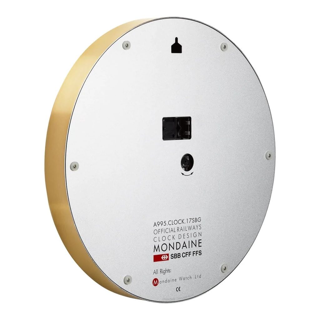 Hodinky Mondaine A995.CLOCK.17SBG majú hliníkové puzdro s povrchovou úpravou IP gold a v priemere 40 cm je v nich umiestnený quartzový strojček poháňaný batériou. Vyniká plynulou prevádzkou. Ciferník je chránený tvrdeným minerálnym sklom.