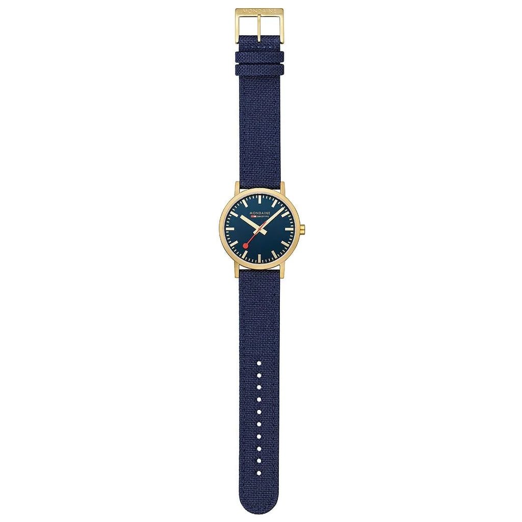 Puzdro hodiniek Mondaine A660.30360.40SBQ je vyrobené z nehrdzavejúcej ocele so zlatou PVD úpravou a hodinky držia na ruke vďaka textilnému remienku. Presnejšie povedané, ide o textíliu vyrobenú z recyklovaných PET fliaš s korkovou podšívkou, vďaka ktorej je remienok veľmi pohodlný na nosenie a jeho výroba je šetrná k životnému prostrediu. Farba remienka je zladená s ciferníkom.