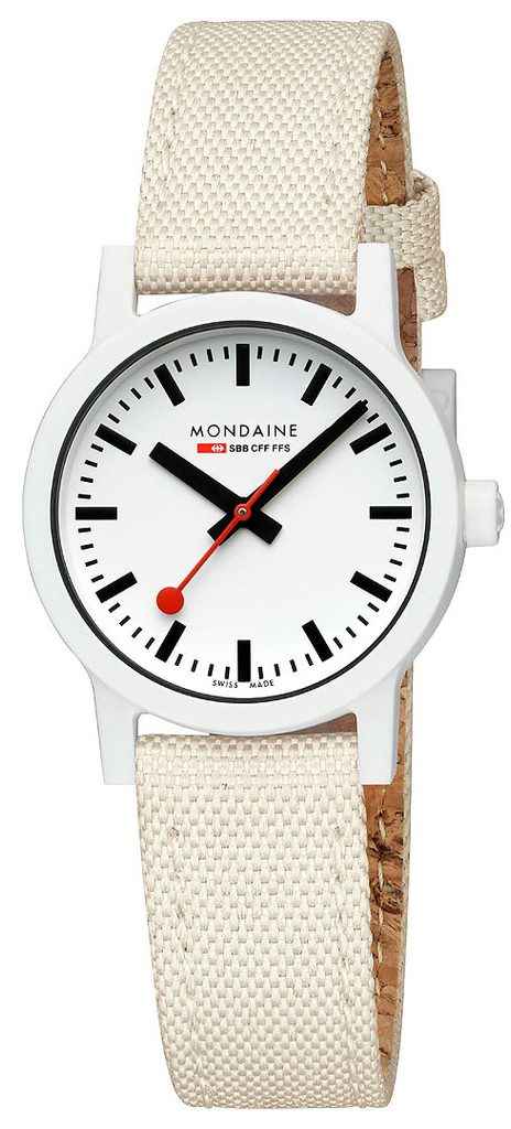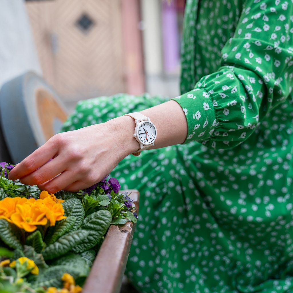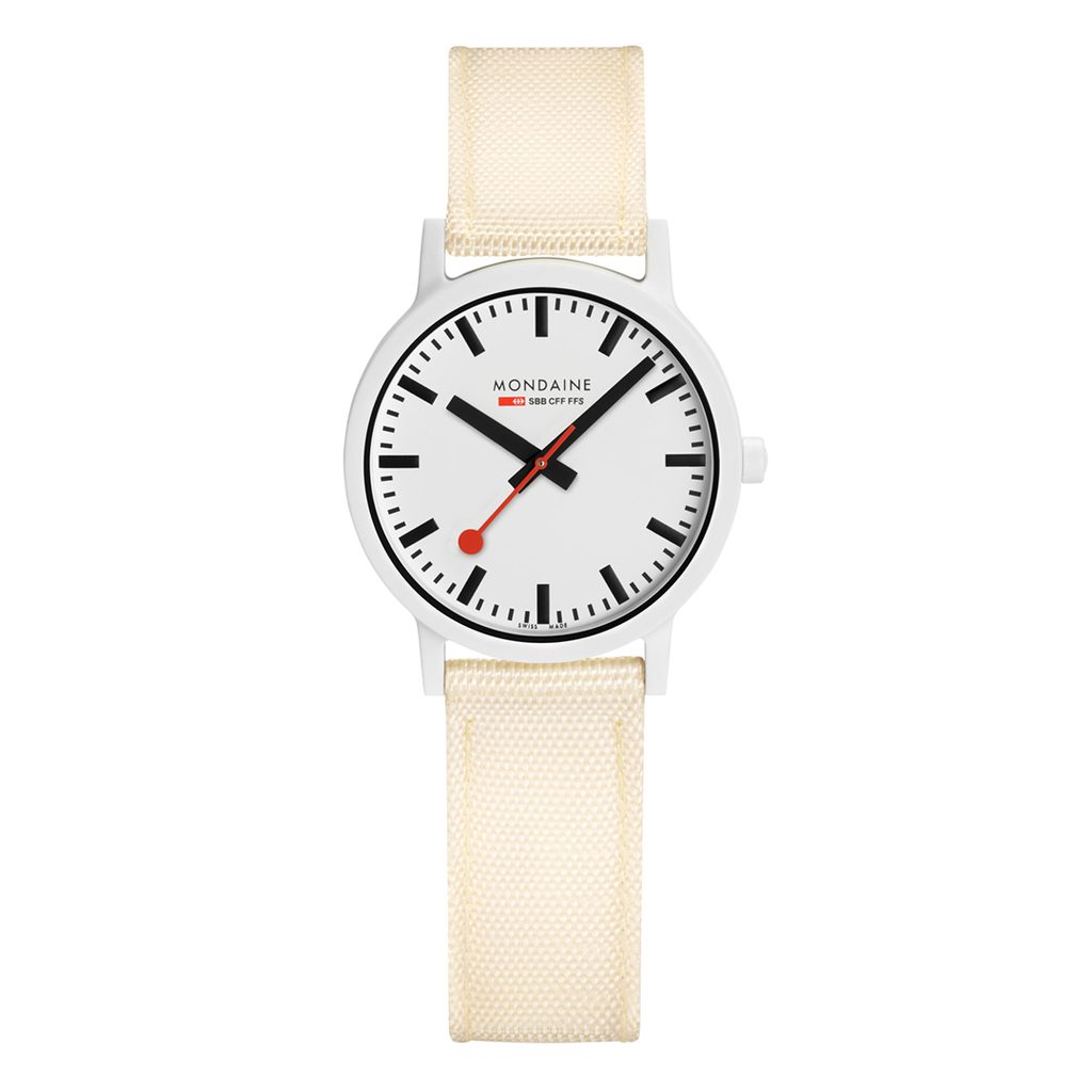 Puzdro hodiniek Mondaine MS1.32111.LT je vyrobené z polyamidu na biologickej báze (na báze ricínového oleja) a hodinky držia na ruke vďaka textilnému remienku. Presnejšie povedané, ide o textíliu vyrobenú z recyklovaných PET fliaš s korkovou podšívkou, vďaka čomu je remienok veľmi pohodlný na nosenie a zároveň je jeho výroba šetrná k životnému prostrediu. Ak teda hľadáte hodinky, ktoré sú šetrné k životnému prostrediu, celý rad Mondaine Essence je určený práve pre vás.