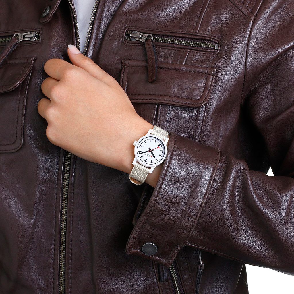 Veľmi priehľadný biely ciferník je chránený tvrdeným minerálnym sklíčkom. Nezameniteľným symbolom značky Mondaine je červená sekundová ručička.