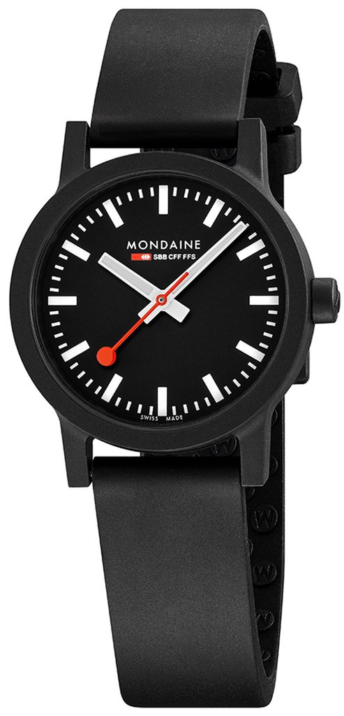 Veľmi prehľadný čierny číselník je chránený tvrdeným minerálnym sklíčkom a farebne ladí s remienkom. Nezameniteľným symbolom je pre značku Mondaine červená sekundová ručička.