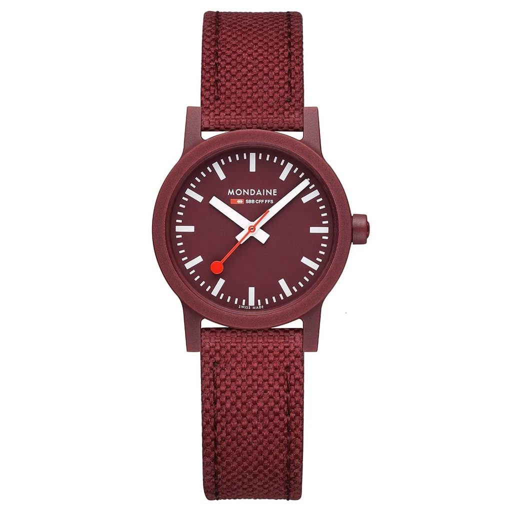 Veľmi prehľadný bordový ciferník je chránený tvrdeným minerálnym sklíčkom. Nezameniteľným symbolom značky Mondaine je červená sekundová ručička.