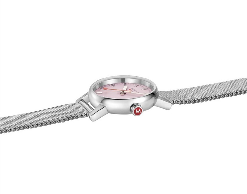 Veľmi prehľadný ciferník jemnej ružovej farby chráni zafírové sklíčko, ktoré je veľmi odolné proti poškriabaniu. Červená sekundová ručička je nezameniteľným symbolom značky Mondaine.