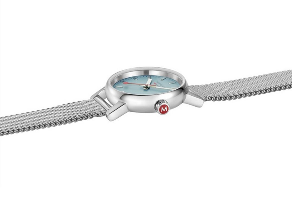 Veľmi prehľadný ciferník v svetlomodrej farbe je chránený zafírovým sklíčkom, ktoré je veľmi odolné voči poškriabaniu. Červená sekundová ručička je nezameniteľným symbolom značky Mondaine.