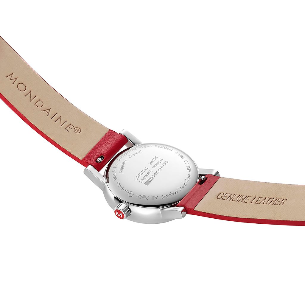 Puzdro hodiniek Mondaine Evo2 MSE.30210.LC je vyrobené z nehrdzavejúcej ocele a hodinky držia na zápästí vďaka kvalitnému červenému koženému remienku s klasickou striebornou trnovou sponou.
