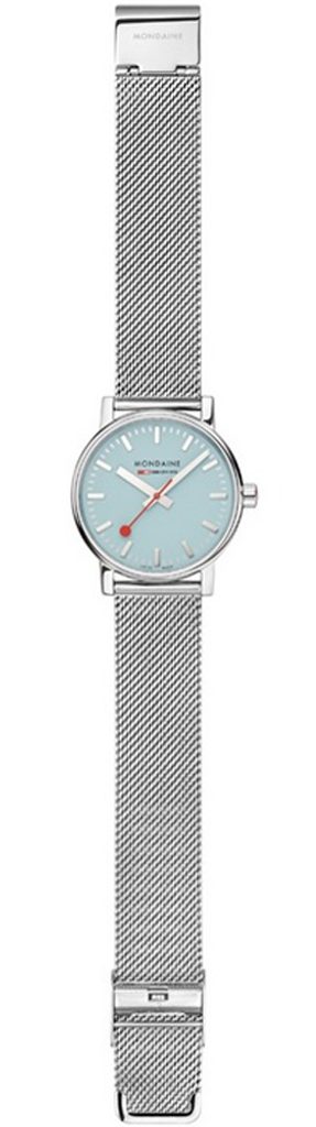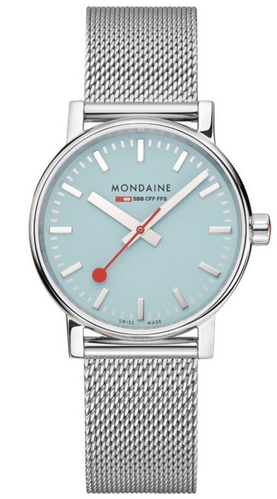 Veľmi prehľadný ciferník v svetlomodrej farbe je chránený zafírovým sklíčkom, ktoré je veľmi odolné voči poškriabaniu. Červená sekundová ručička je nezameniteľným symbolom značky Mondaine.