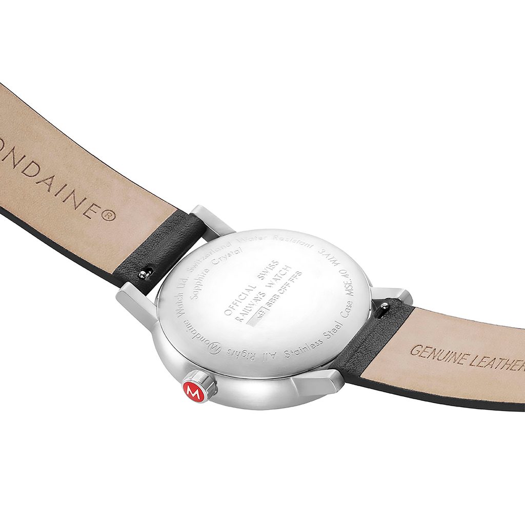 Veľmi prehľadný biely číselník je chránený zafírovým sklíčkom, ktoré je veľmi odolné voči poškriabaniu. Na pozícii 3. hodiny sa nachádza praktický ukazovateľ dátumu. Nezameniteľným symbolom je pre značku Mondaine červená sekundová ručička.