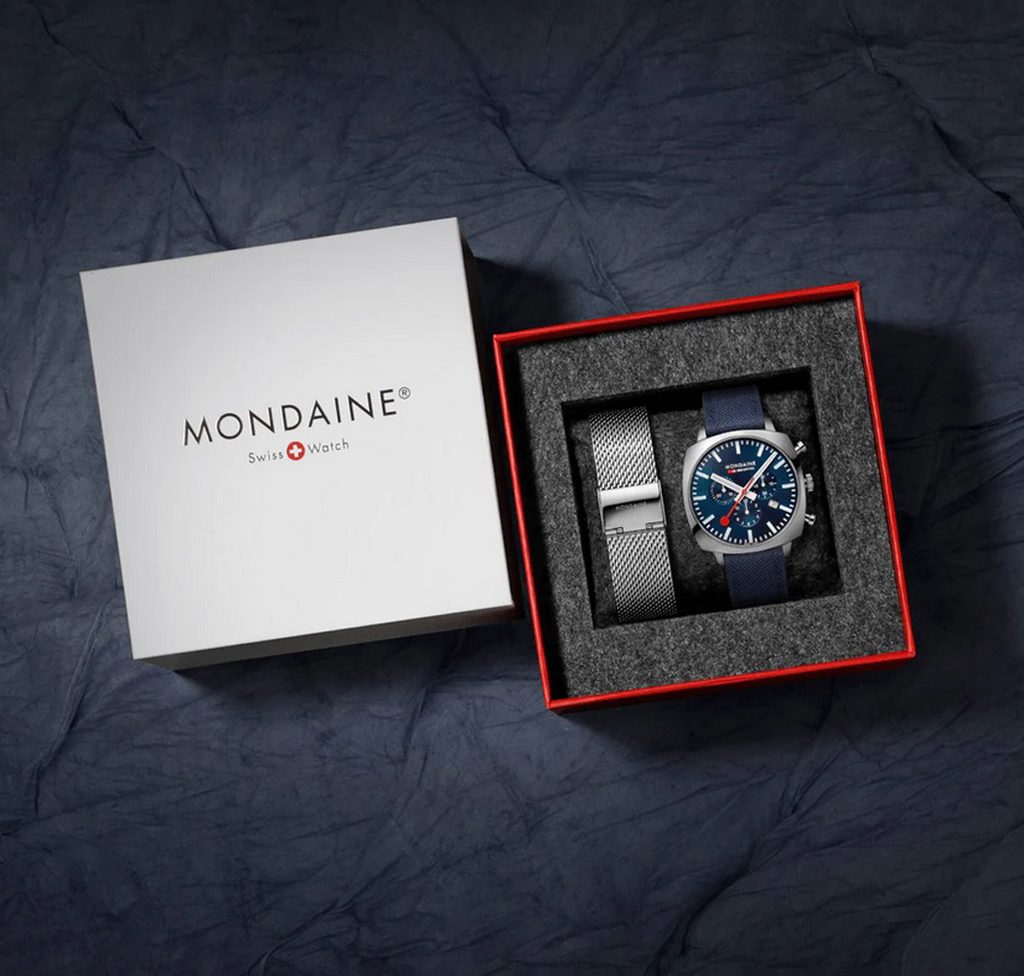 Puzdro hodiniek Mondaine Squar Chrono MSL.41440.LD.SET je vyrobené z nehrdzavejúcej ocele s leštenou povrchovou úpravou a hodinky držia na zápästí vďaka modrému textilu. Presnejšie, ide o textíliu vyrobenú z recyklovaných PET fliaš s korkovou podšívkou, vďaka ktorej je remienok veľmi pohodlný na nosenie a jeho výroba je zároveň šetrná k životnému prostrediu.