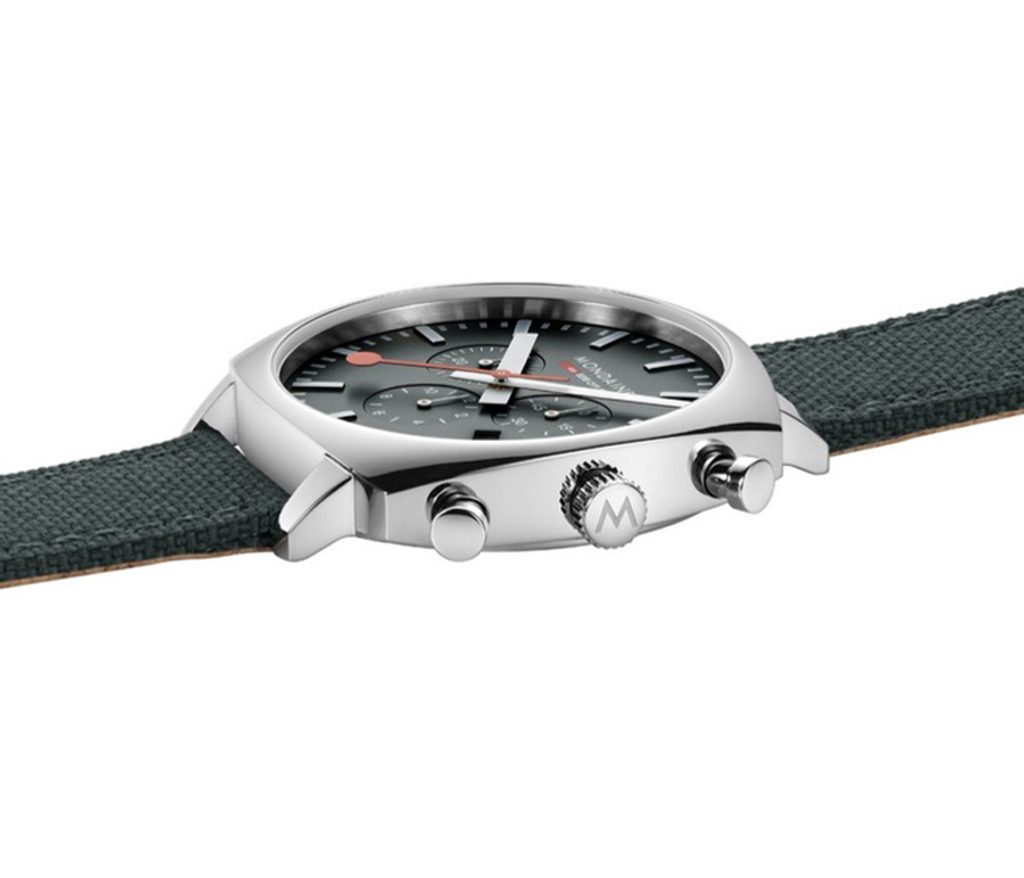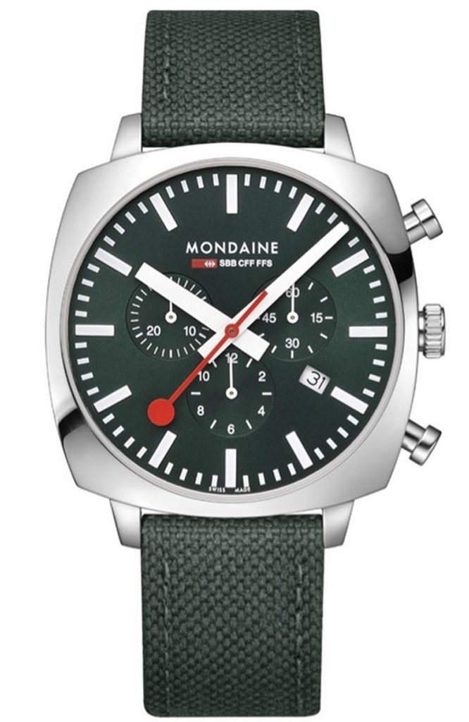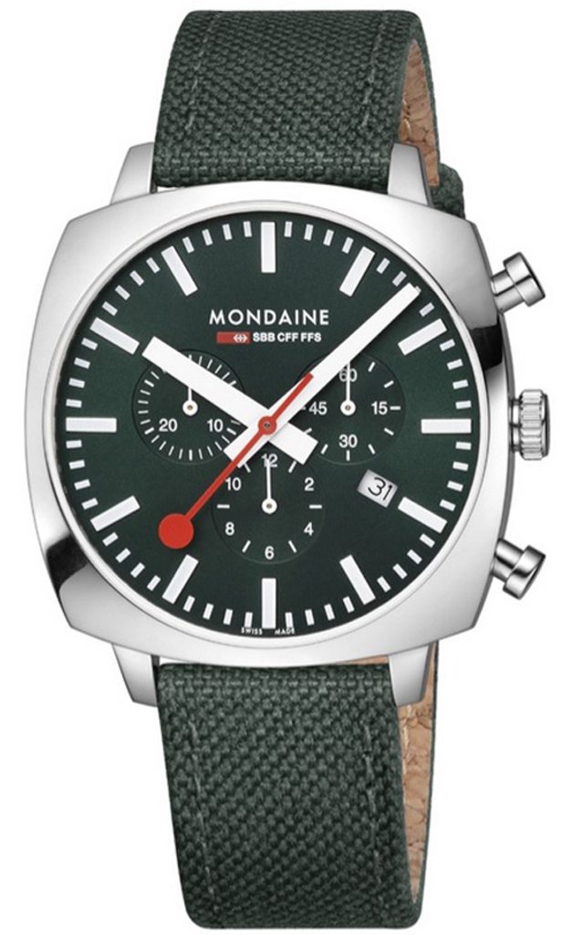 Puzdro hodiniek Mondaine Squar Chrono MSL.41460.LF.SET je vyrobené z nehrdzavejúcej ocele s lešteným povrchom a hodinky držia na zápästí vďaka zelenej textílii. Presnejšie, ide o textíliu vyrobenú z recyklovaných PET fliaš s korkovou podšívkou, vďaka ktorej je remienok veľmi pohodlný na nosenie a jeho výroba je zároveň šetrná k životnému prostrediu.