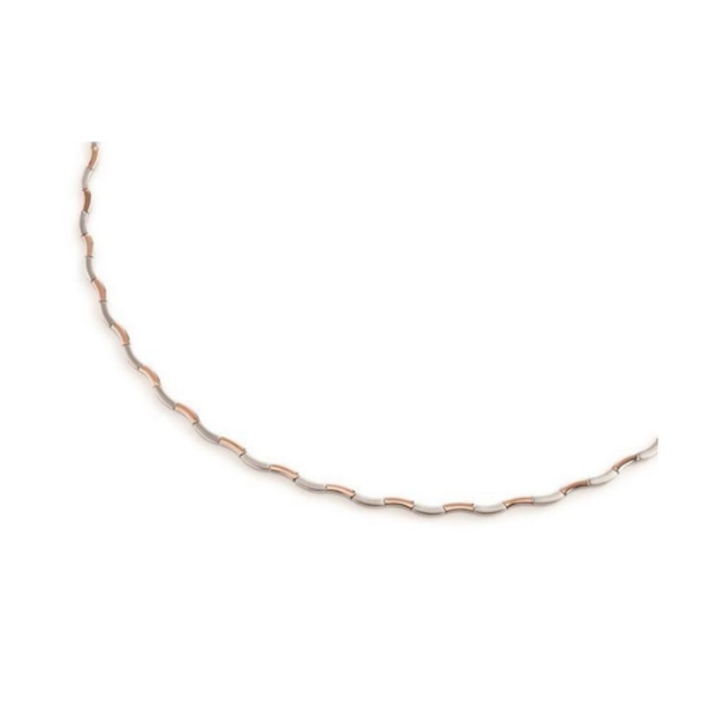 Asymetricky tvarovaný dámsky náhrdelník z kolekcie Boccia Titanium v modernom podaní vás nepochybne osloví na prvý pohľad. Jeho čaro spočíva predovšetkým v zakrivených častiach, ktoré pravidelne striedajú matný titán a lesklé ružové zlato. Nekomplikovaný a nadčasový šperk ide ruka v ruke s originalitou. Náhrdelník je vyrobený z titánu, ktorý je ľahký, pevný a hypoalergénny. Preto je vhodný aj pre ľudí so zvýšenou citlivosťou na kovy.