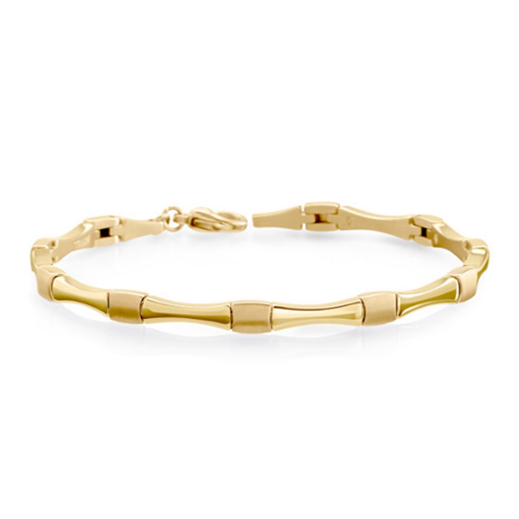 Sofistikovaný dizajn podčiarknutý nadčasovým štýlom. Presne v tomto duchu sa nesie náramok Boccia Titanium, ktorý si na prvý dojem získa veľa sympatií. Základom je pokovovanie žltým zlatom v lesklej povrchovej úprave, vďaka ktorému náramok získava jemný a elegantný charakter. Čo vás však príjemne prekvapí, je zaujímavé tvarovanie jednotlivých častí, ktoré náramku dodávajú nádych nevšednosti. Vďaka svojmu vzhľadu je ideálny na všetky príležitosti. Zapína sa klasicky pomocou karabíny. Náramok je vyrobený z titánu, ktorý je ľahký, pevný a hypoalergénny. Preto je vhodný aj pre ľudí so zvýšenou citlivosťou na kovy.