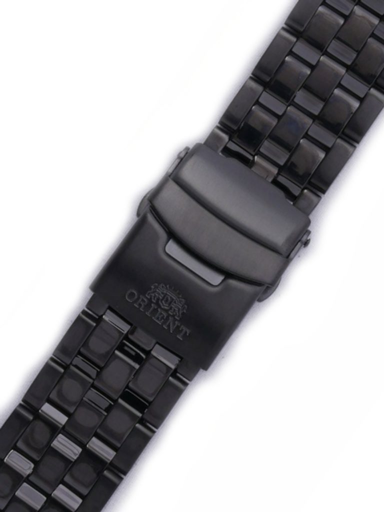 Originálny čierny oceľový náramok Orient so šírkou 22 mm sa môže pochváliť praktickou skladacou sponou v čiernej farbe a dizajnom nenáročným na údržbu.