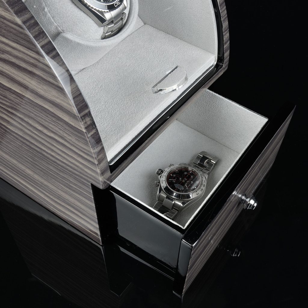 Naťahovač Designhütte Basel 1 70005-37 hnedej farby, pre 1 kus mechanických hodiniek s automatickým náťahom, ktorý zaujme svojim moderným dizajnom. Vyrobené z dreva so vzorom duba. Okrem rotora disponuje naťahovač aj ďalším úložným priestorom. Vďaka rôznym režimom otáčania je vhodný takmer pre všetky bežné hodinky s automatickým náťahom.
