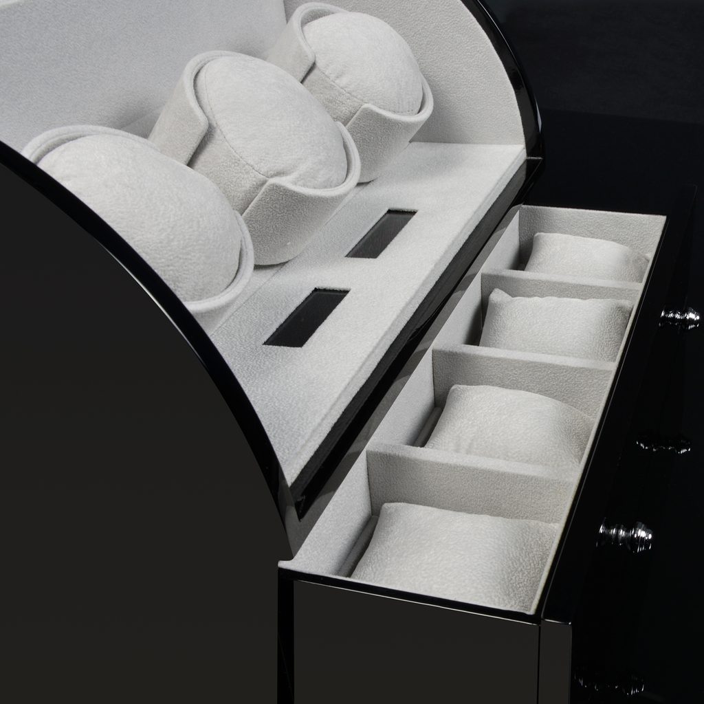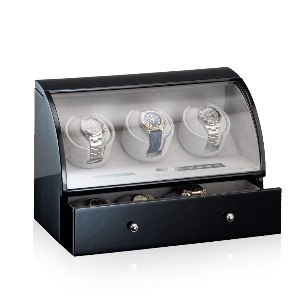 Designhütte Basel 3 LCD 70005-25 čierny naťahovač hodiniek pre 3 mechanické hodinky s automatickým naťahovaním, ktorý zaujme svojím moderným dizajnom. Vyrobené z dreva s čiernym lakom. Okrem troch rotorov, ktorých otáčanie sa dá nastaviť nezávisle, má naťahovač aj ďalší úložný priestor. Ovládanie prebieha prostredníctvom LCD displeja. Vďaka rôznym režimom otáčania je vhodný pre takmer všetky bežné hodinky s automatickým naťahovaním.