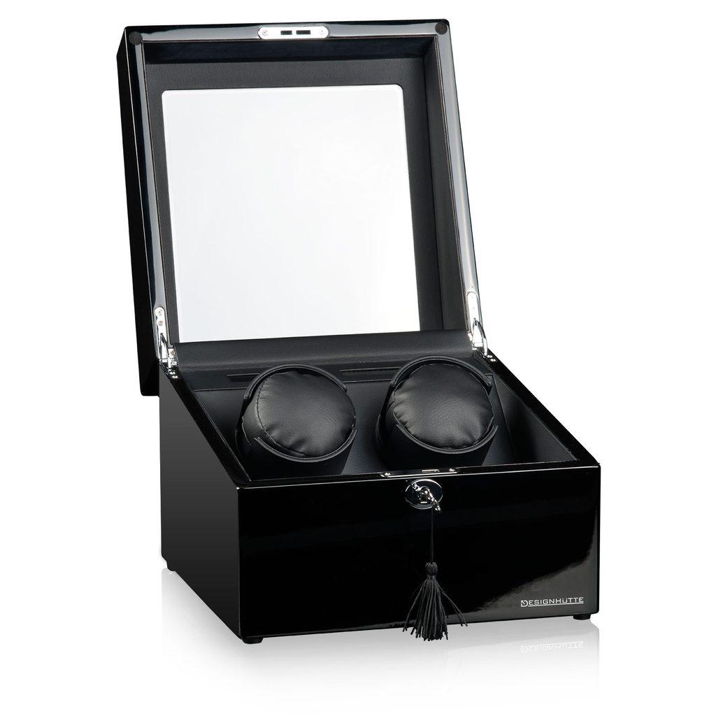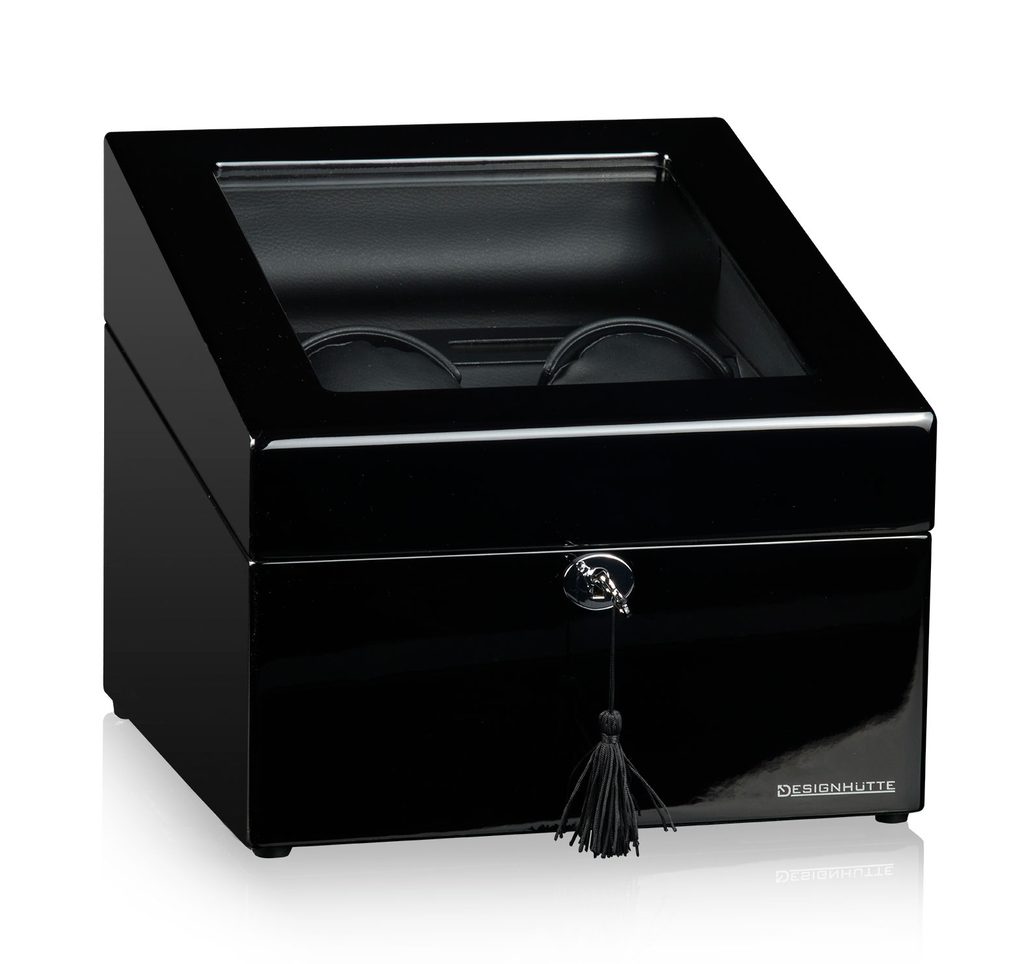 Naťahovač Designhütte München 2 70005-47 čierny, pre 2 kusy mechanických hodiniek s automatickým naťahovaním. Okrem toho je v prednej časti naťahovača priestor až na štyri ďalšie hodinky na samostatných podložkách.