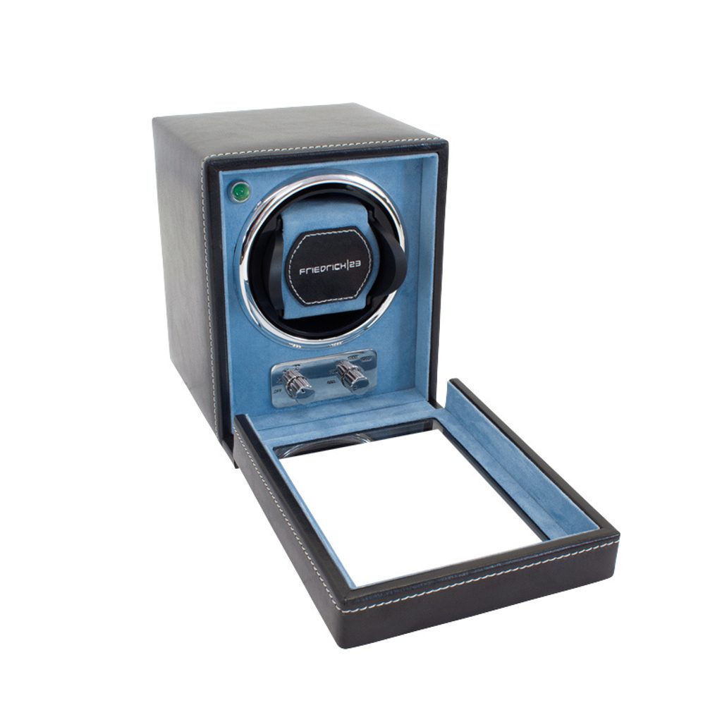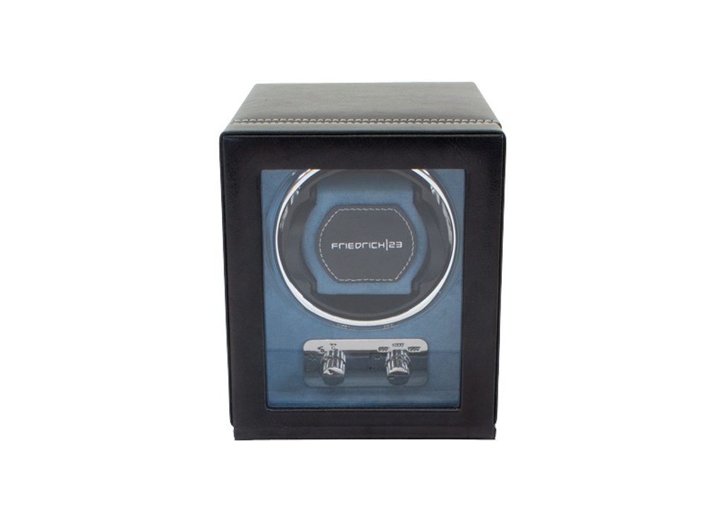 Naťahovač Friedrich Lederwaren Bond 29481-2 čiernej farby pre 1 kus mechanických hodiniek s automatickým náťahom, ktorý zaujme svojím klasickým dizajnom. Je vyrobený zo syntetického materiálu a jeho vnútorná časť je vyvedená v modrej farbe. Vďaka rôznym režimom otáčania je vhodný pre takmer všetky bežné hodinky s automatickým naťahovaním. Ciferník hodiniek je vyrobený z plexiskla. Adaptér je súčasťou balenia, možno ho napájať aj 4 tužkovými batériami.