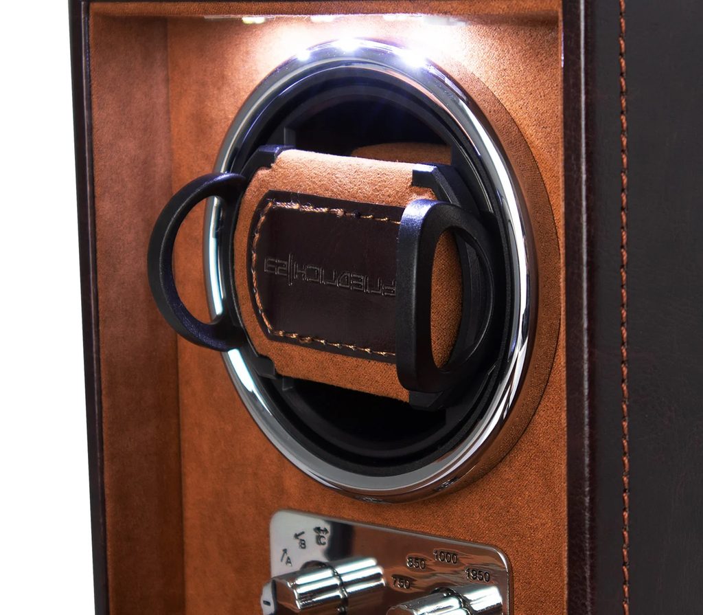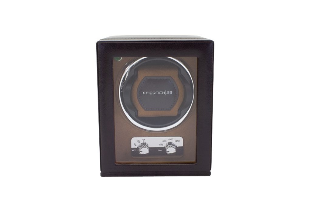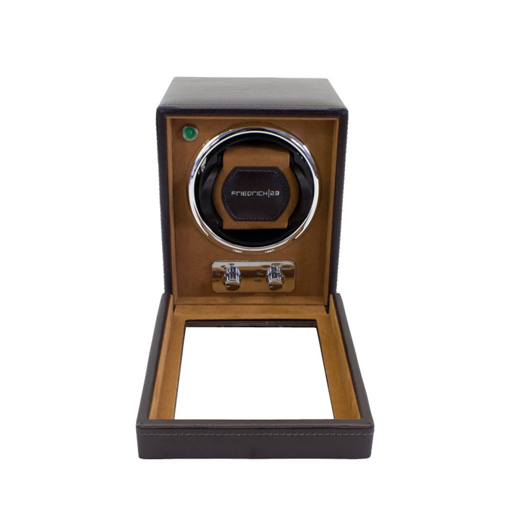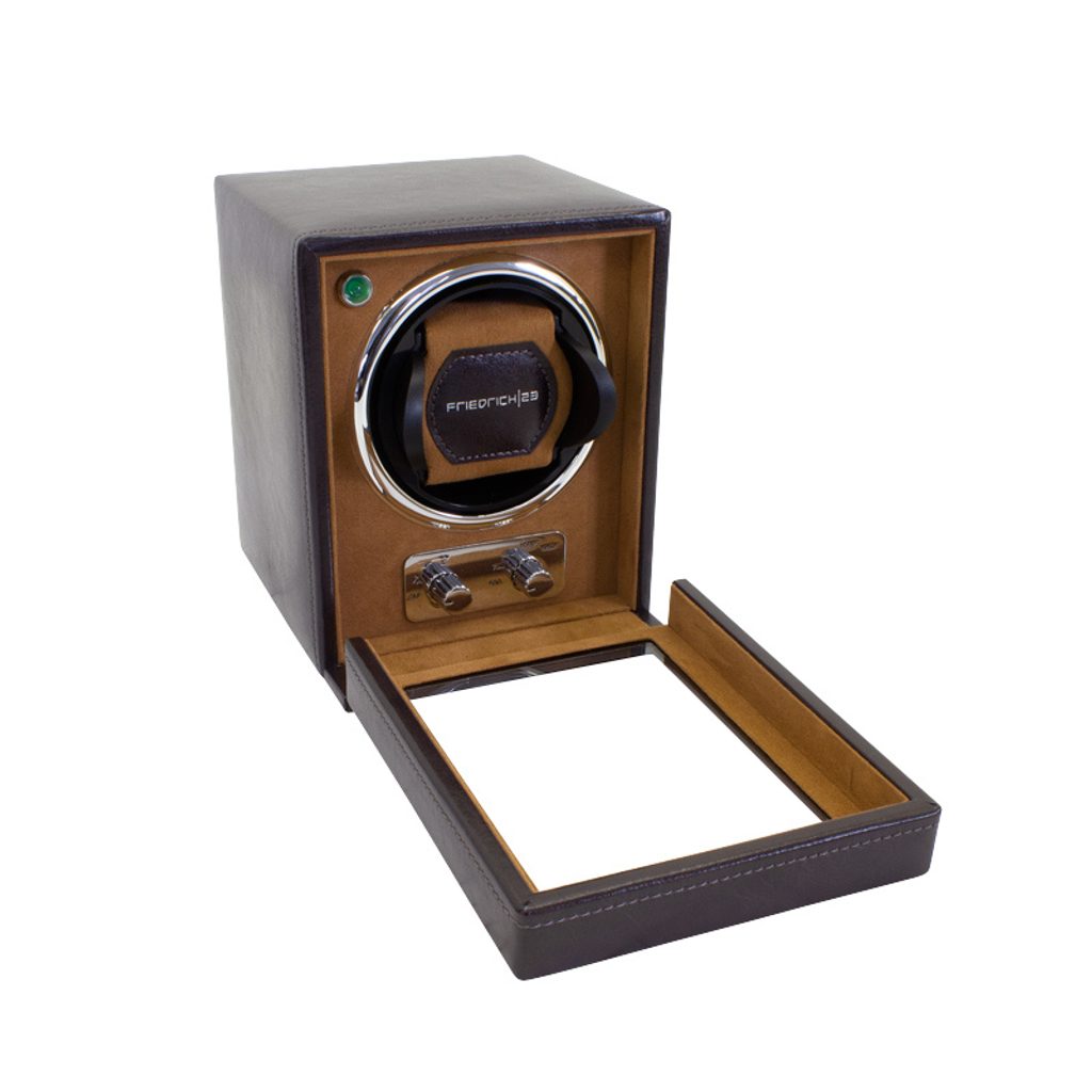 Hnedý naťahovač hodiniek Friedrich Lederwaren Bond 29481-3 pre 1 ks mechanických hodiniek s automatickým naťahovaním, ktorý zaujme svojím klasickým dizajnom. Je vyrobený zo syntetického materiálu a jeho vnútro je vyvedené v hnedej farbe. Vďaka rôznym režimom otáčania je vhodný pre takmer všetky bežné hodinky s automatickým naťahovaním. Adaptér je súčasťou balenia, možno ho napájať aj 4 tužkovými batériami.