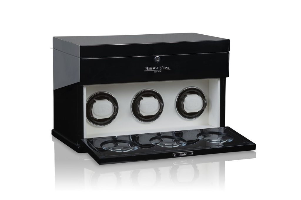 Naťahovač Heisse & Söhne Loop 70019-244.142 pre 3 kusy mechanických hodiniek s automatickým naťahovaním. Okrem nosenia kvalitných hodiniek pravdepodobne neexistuje štýlovejší spôsob uloženia exkluzívnych hodiniek s automatickým naťahovaním. Elegantné otáčanie troch hodiniek môžete sledovať cez sklenené priezory, ktoré opticky zväčšujú umiestnené hodinky.