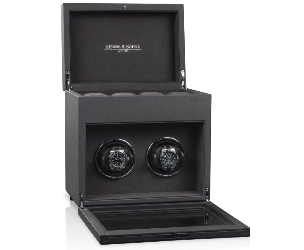Naťahovač Heisse & Söhne Vancouver 2 70019-204.142.50 čiernej farby, pre 2 mechanické hodinky s automatickým naťahovaním. Pod horným vekom nájdeme úložný priestor na ďalšie štyri hodinky. Mäkké podložky pod hodinky v hornom priestore sú na oboch stranách vybavené pochrómovanými vodiacimi kolíkmi, ktoré zabraňujú skĺznutiu hodiniek. Natahovač je potiahnutý kvalitnou imitáciou kože hnedej farby s hnedým interiérom.