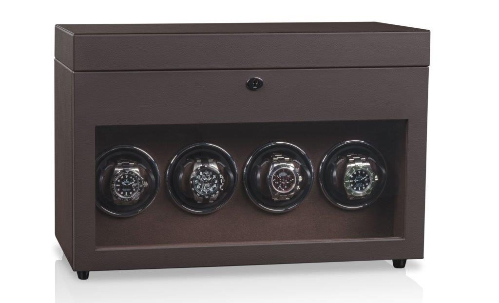 Naťahovač Heisse & Söhne Vancouver 4 70019-205.141.141 hnedej farby, pre 4 mechanické hodinky s automatickým naťahovaním. Pod horným vekom nájdeme úložný priestor pre ďalších šesť hodiniek. Mäkké podložky pod hodinky v hornom priestore majú na oboch stranách pochrómované vodiace kolíky, ktoré zabraňujú skĺznutiu hodiniek. Natáčač je potiahnutý kvalitnou imitáciou kože hnedej farby s hnedým interiérom.